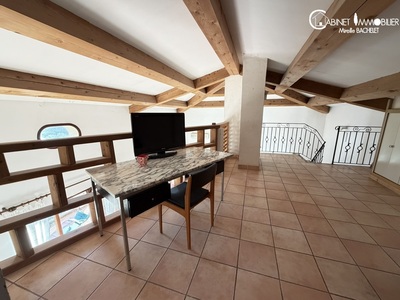 Depuis le salon bel escalier pour accéder à la mezzanine très haute avec espace bureau, grands placards, une chambre avec salle d'eau et wc.