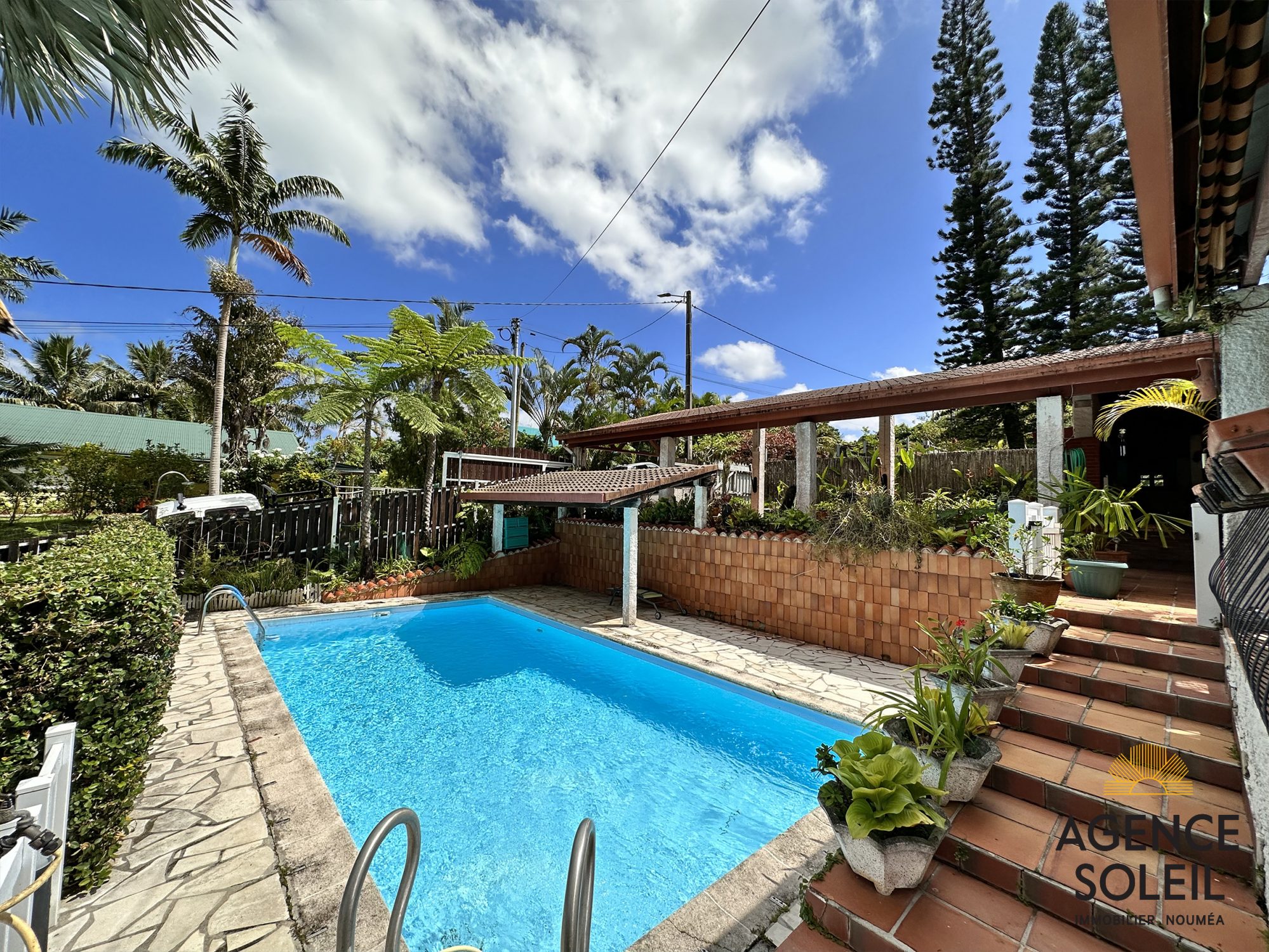 Terrasses, piscine, atelier, grand carport pour plusieurs véhicules, coin BBQ.