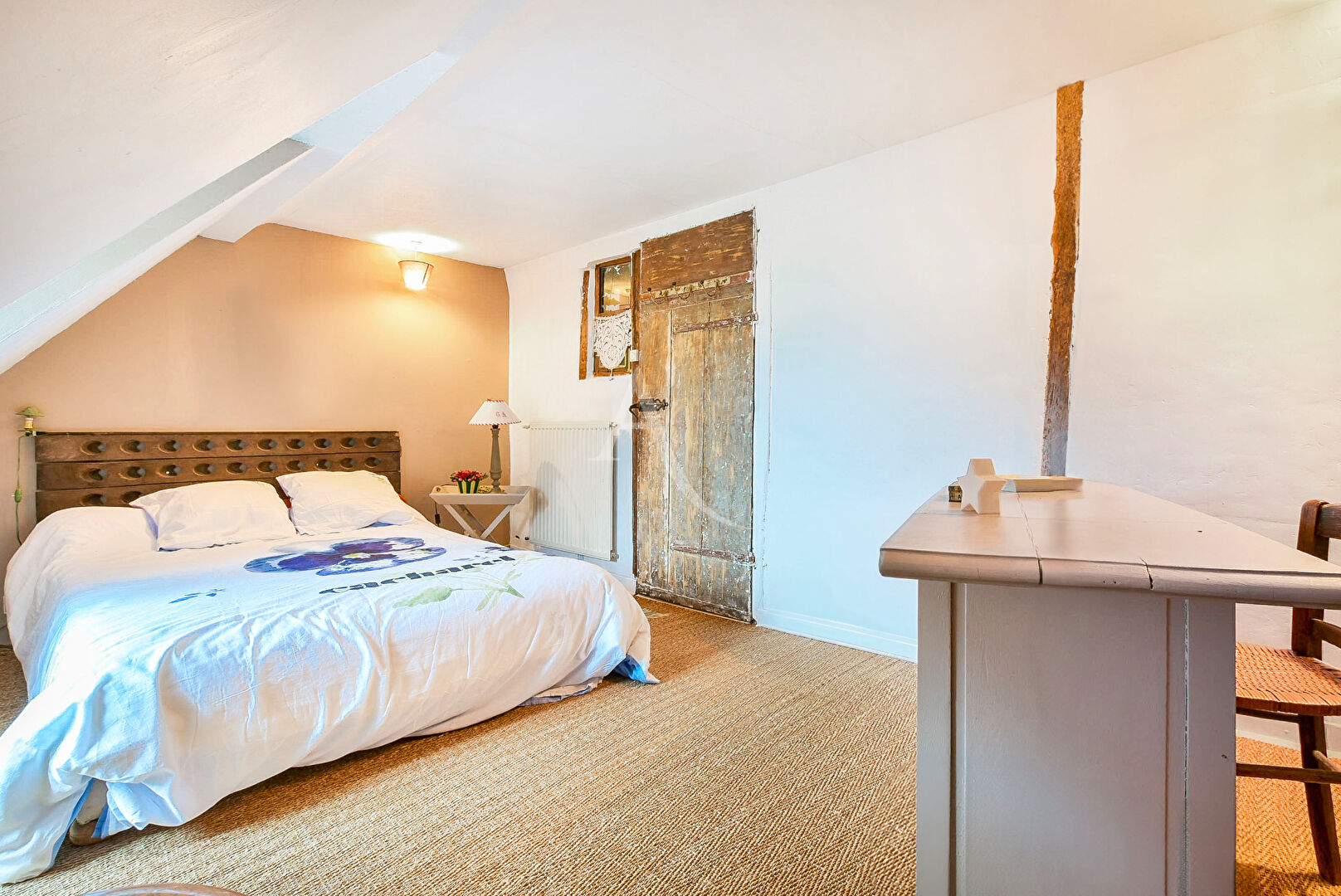Dès l'entrée, un garage double offre un espace pratique, tandis qu'une cour intérieure pavée relie les différents espaces. Le vaste séjour très moderne cathédrale de plus de 70 mètres carrés, agrémenté d'un poêle à bois et d'une imposante cheminée, crée une atmosphère accueillante et conviviale. Une mezzanine ajoute un espace bureau avec une touche d'élégance, tandis qu'un WC avec point d'eau assure votre confort au rez-de-chaussée.
