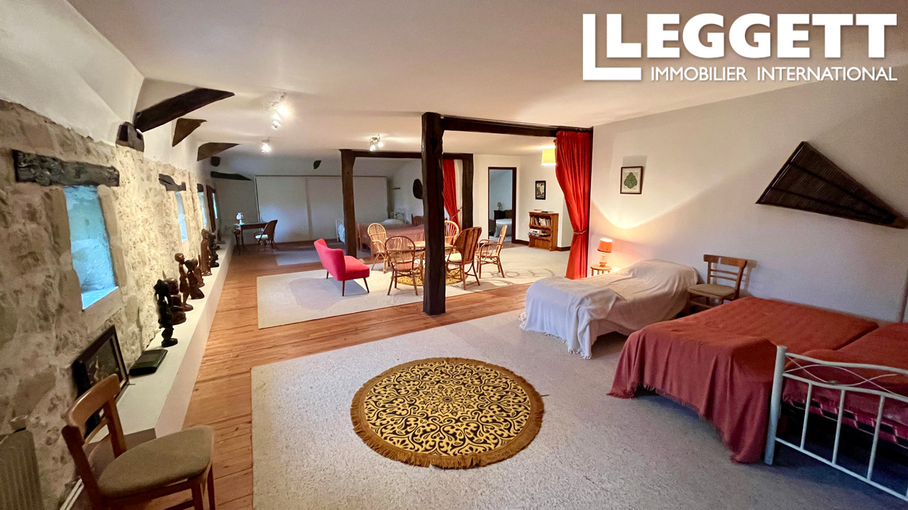 L'impressionnant grenier aménagé, avec ses poutres en bois et ses pierres apparentes, est idéal pour un studio, une salle de loisirs ou un logement supplémentaire.