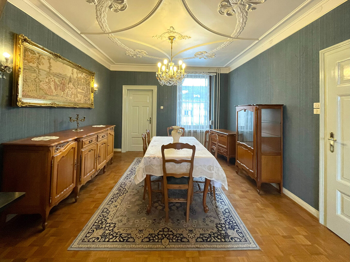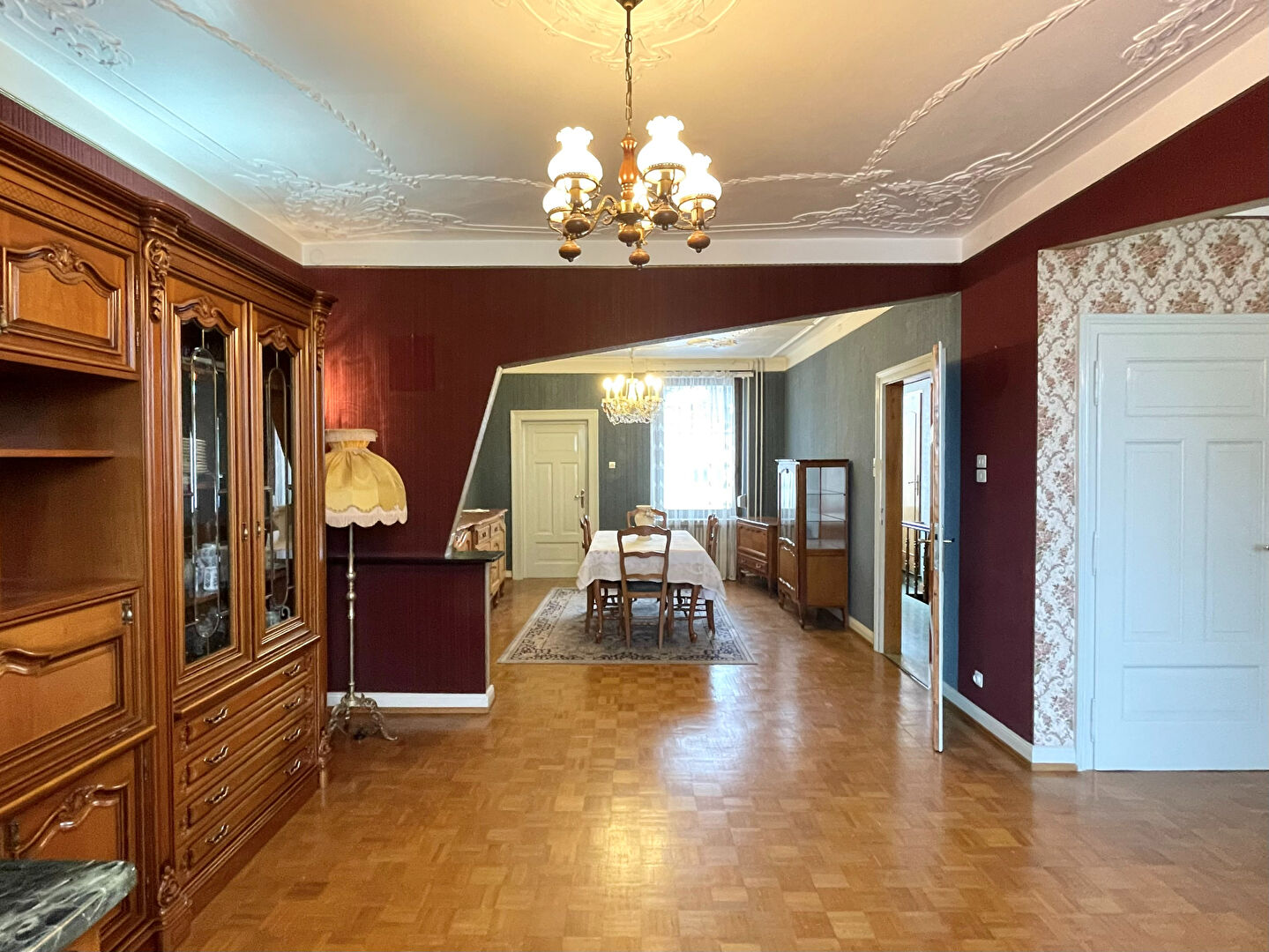 Au rez-de-chaussée, elle se compose d'un salon avec parquet massif et moulures remarquables, de deux chambres, d'une grande cuisine, d'un WC, d'une véranda et d'une salle d'eau.