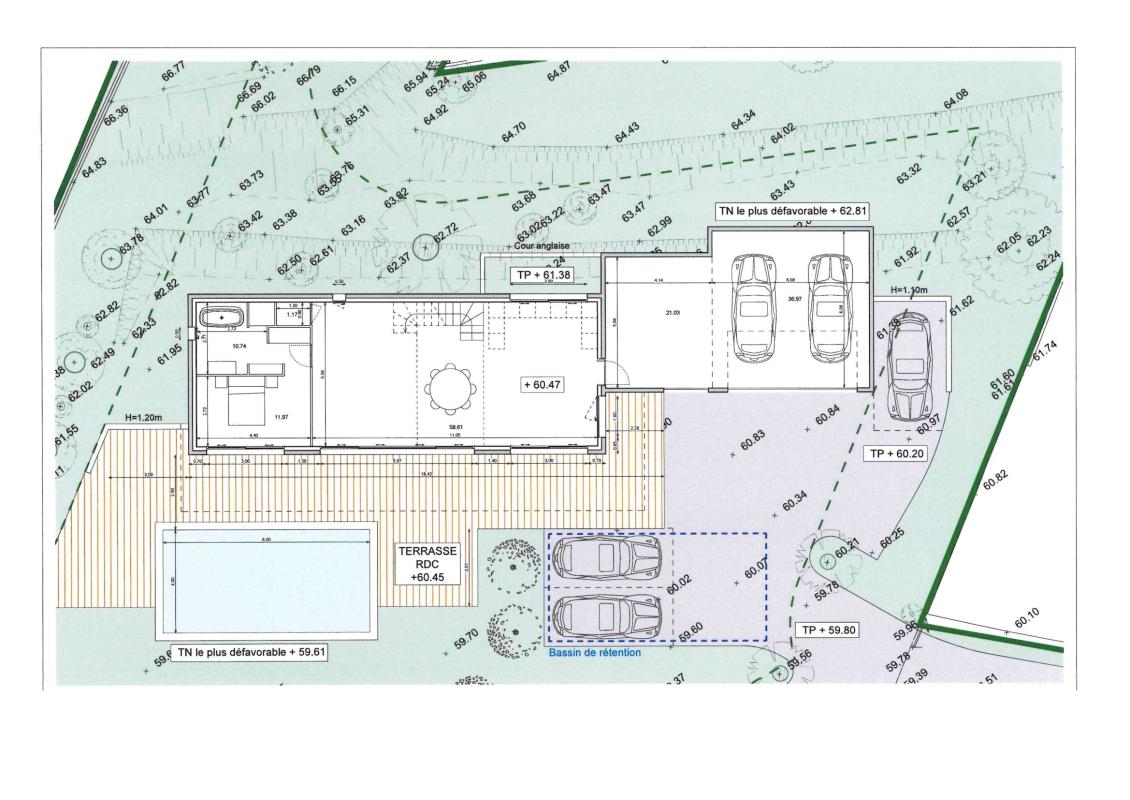Ce terrain est vendu avec un permis de construire déjà accordé pour une villa contemporaine avec piscine. La future maison, pensée pour offrir confort et luminosité, se composera :