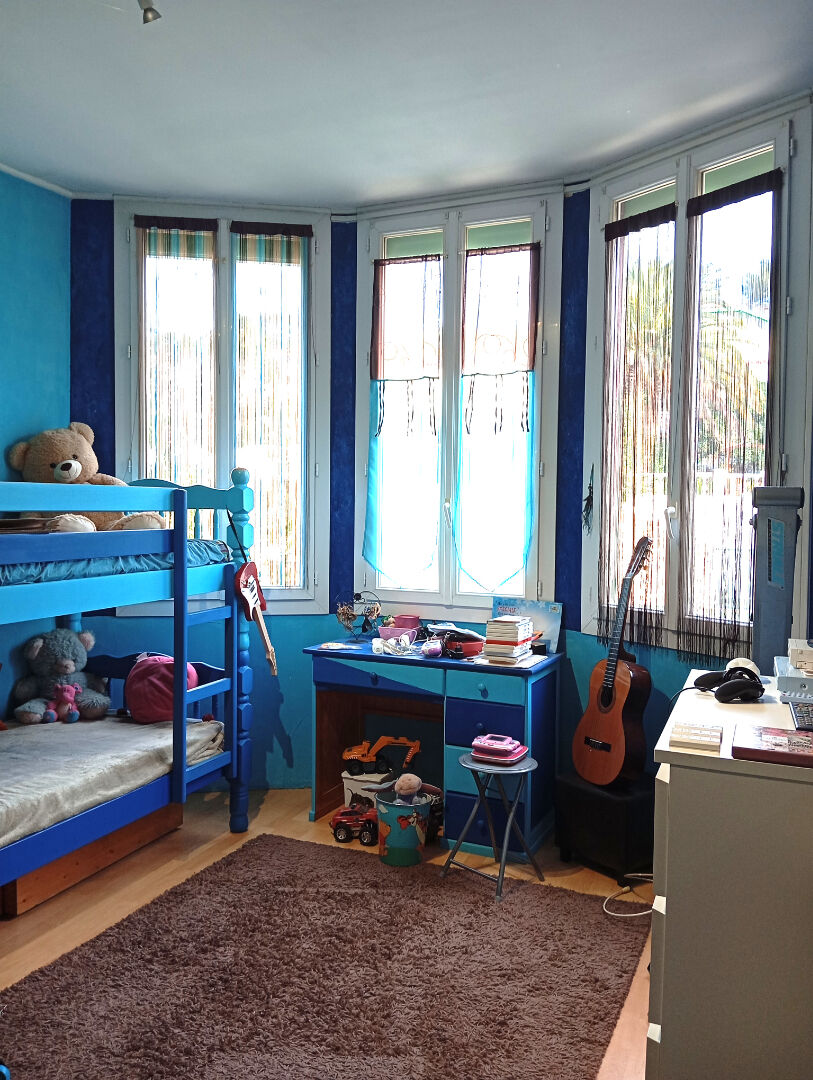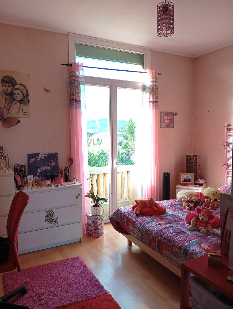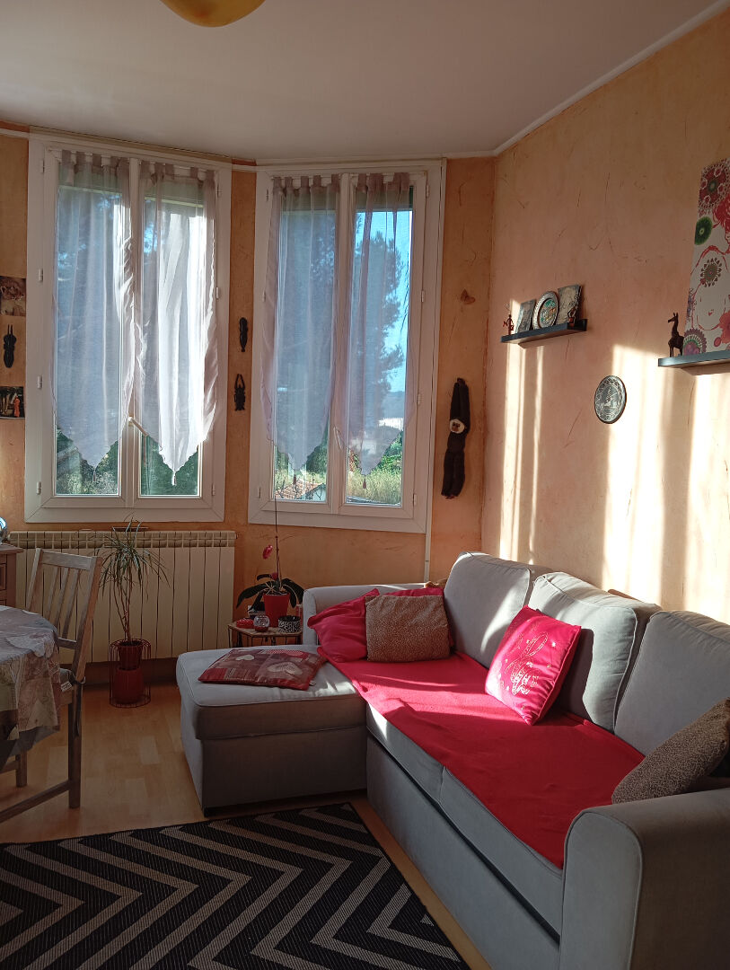 -un appartement T3 d'environ 58m² au premier étage comprenant un séjour ouvert sur une terrasse de 5m², une cuisine séparée, deux chambres, une salle d'eau et des WC indépendants. Il bénéficie d'un cellier avec accès direct dans la cuisine et sur les extérieurs, du double vitrage PVC et de volets roulants électriques.
