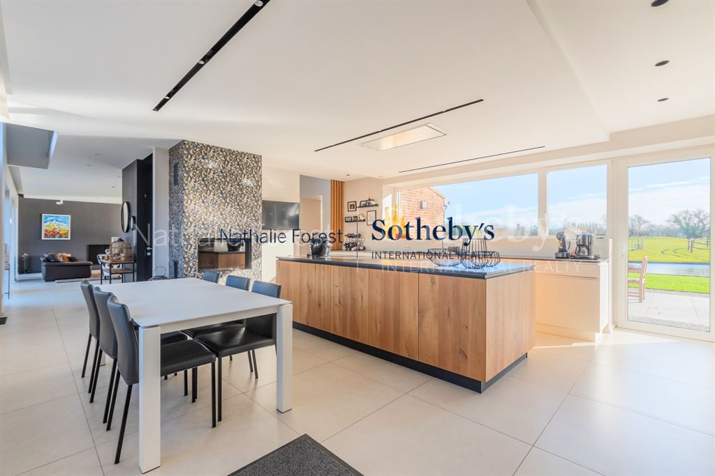 La cuisine, véritable pièce de vie, sur mesure et entièrement équipée (électroménager Siemens haut de gamme), offre plus de 35 m² de convivialité. Dotée d’un îlot central, de plans de travail en granit et d’une seconde cheminée feu de bois, elle s’ouvre sur une terrasse en brique surplombant les étangs. Accès direct à une cave à vin.
