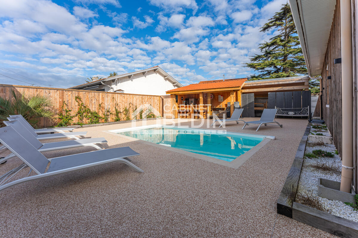 GUJAN - LA HUME. Dans le quartier recherché de La Hume, à deux pas des commerces, du port et de la gare, venez découvrir cette agréable maison rénovée sur deux niveaux comprenant au rez-de-chaussée : quatre chambres, une salle d'eau, une buanderie/salle d'eau, un wc, un salon/séjour central, une cuisine/entrée et une véranda. Au premier étage : deux chambres, un palier et une salle de bains/douche/wc. Pour profiter des beaux jours à plusieurs un extérieur aménagé avec une piscine au sel chauffée entourée d'une agréable terrasse sans entretien ainsi qu'un bar/cuisine d'extérieur couverts. Un local à vélos et un carport accessibles depuis une allée complètent idéalement ce bien.