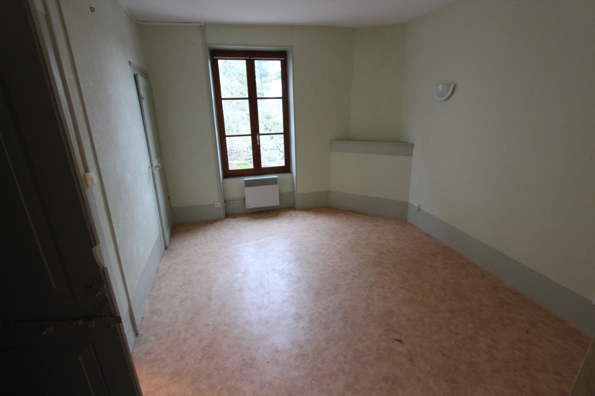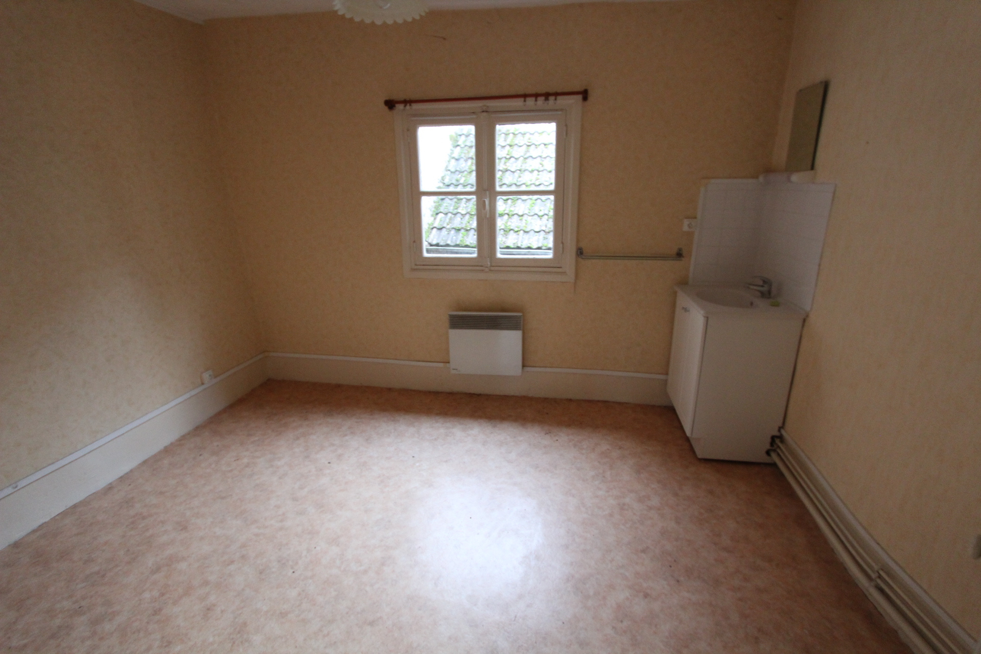 A l'étage deux chambres dont une avec lavabo. Au 2ème étage : grenier aménageable. Chauf électrique. Simple vitrage. DPE 'G'