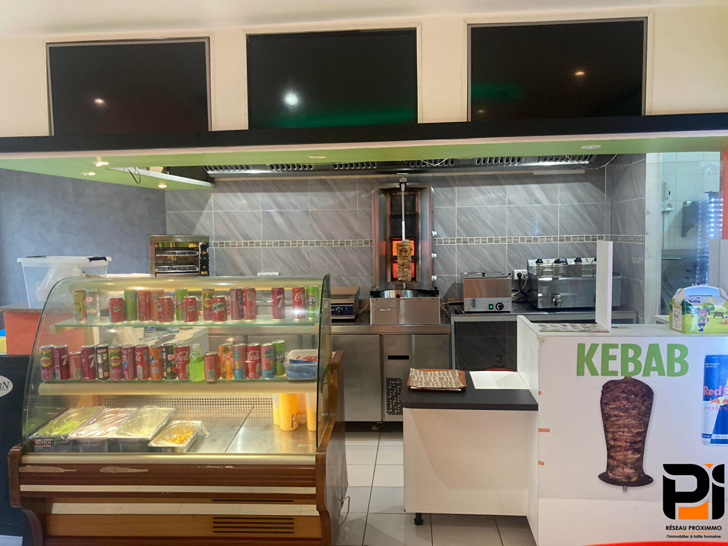 Local commercial aménagé en restauration rapide. Il dispose d'une salle avec cuisine ouverte, d'une arrière cuisine et d'un wc.