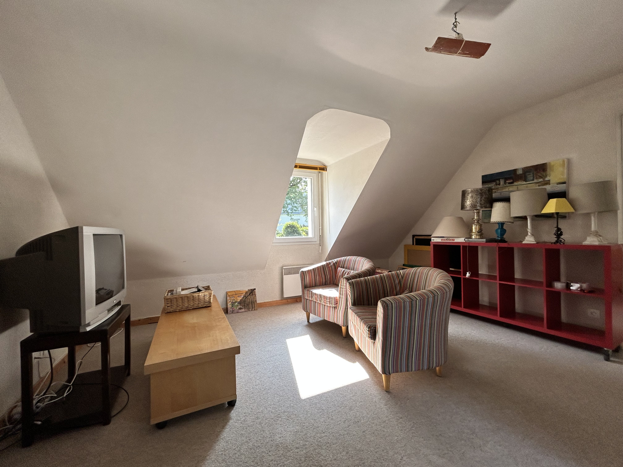 Au rez-de-chaussée : un vaste séjour/salon de 53 m2, offrant une vue imprenable sur la rivière d'Auray, une suite parentale, une cuisine équipée, une buanderie, ainsi qu'un garage.