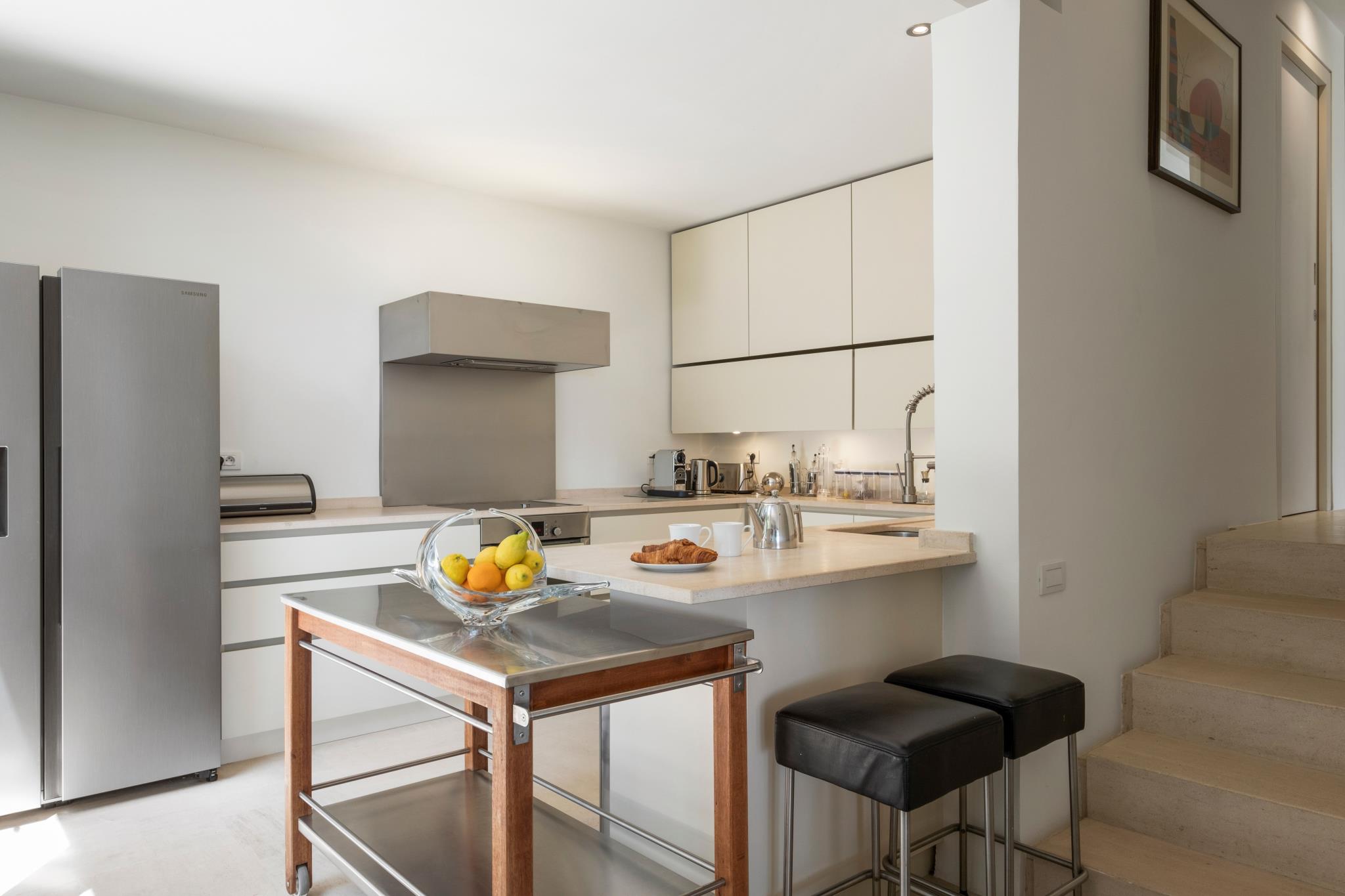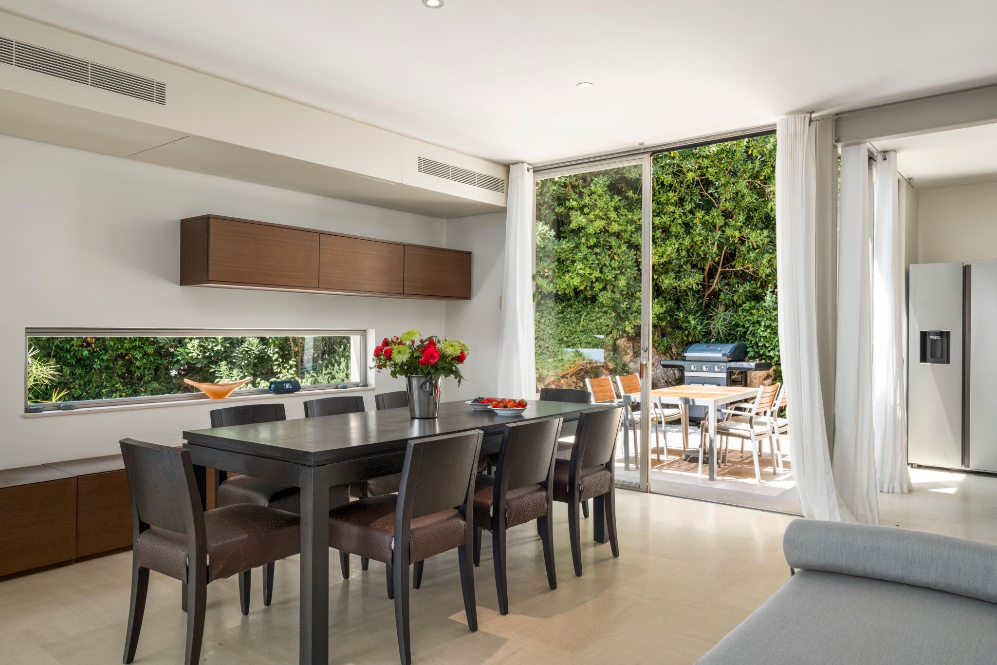La villa se compose de la manière suivante : un spacieux séjour / salle à manger avec cuisine ouverte entièrement équipée avec vue sur la mer et le jardin.