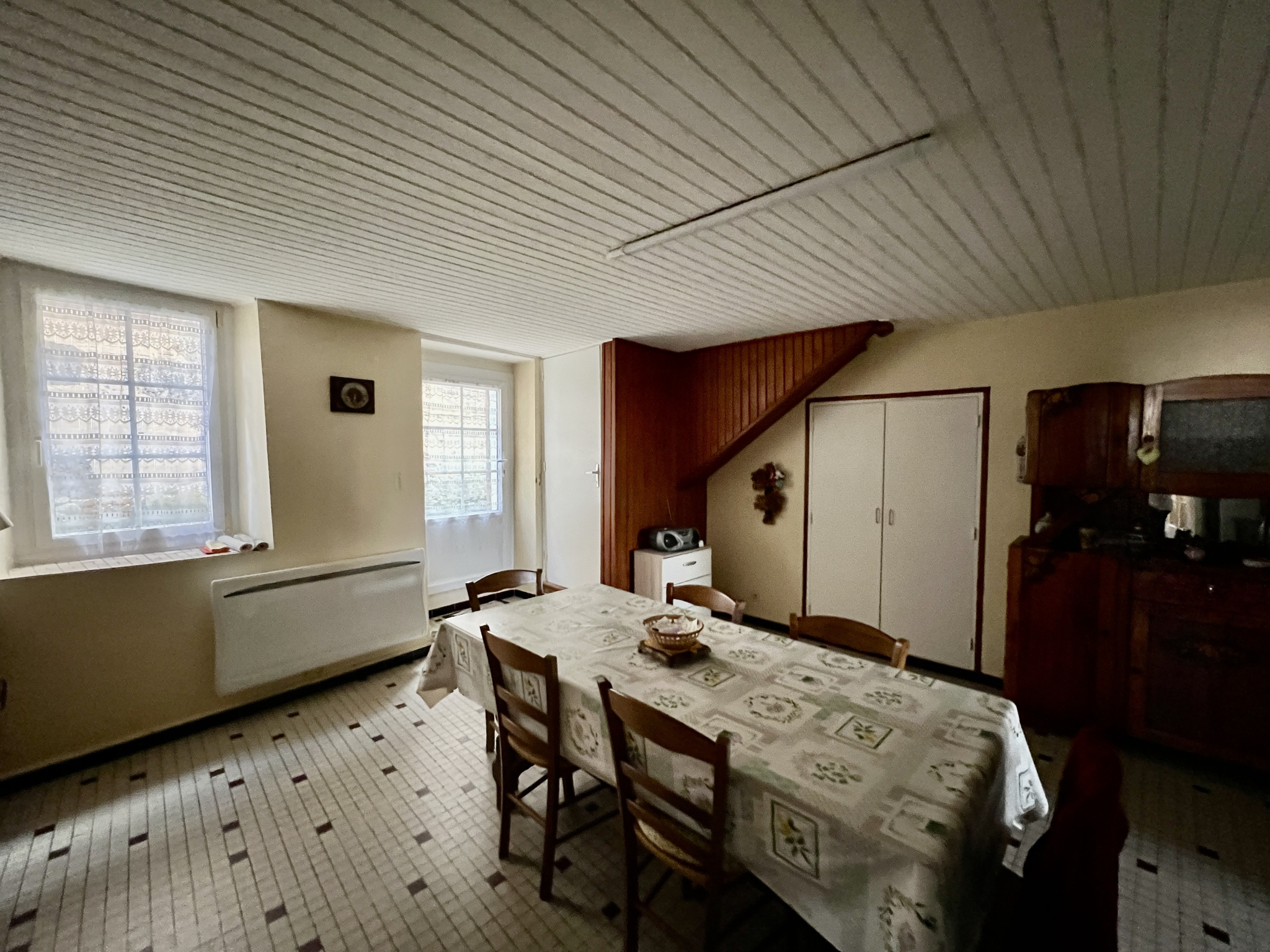 Située au coeur du centre ville du Mas d'Agenais 47430, maison de ville mitoyenne d'un côté comprenant au rez-de-chaussée cuisine, salon-séjour, cellier, salle de bains et WC, et au premier étage, deux chambres.