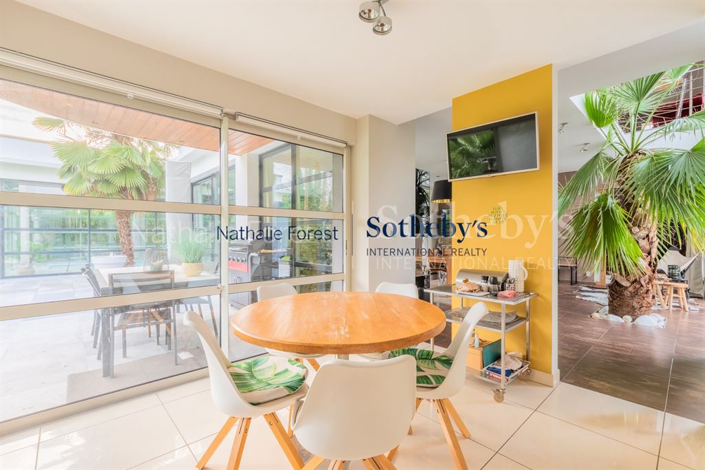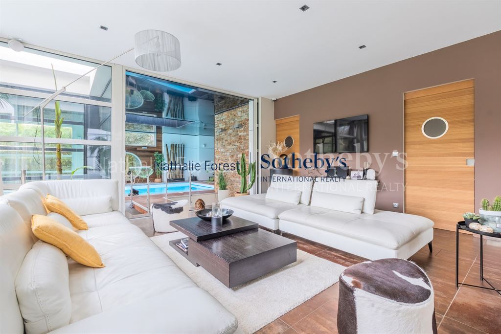 L 'espace dédié à la piscine est un véritable " Spa " , il est également doté de 2 grandes baies vitrées coulissantes qui permettent un accès direct sur la terrasse extérieure et le jardin et possède un magnifique "Hammam" avec salle de massage , plafond en nuit étoilé , douche et toilettes Salon "Home cinéma" entièrement équipé et chambre d'amis avec sa salle douches privative .