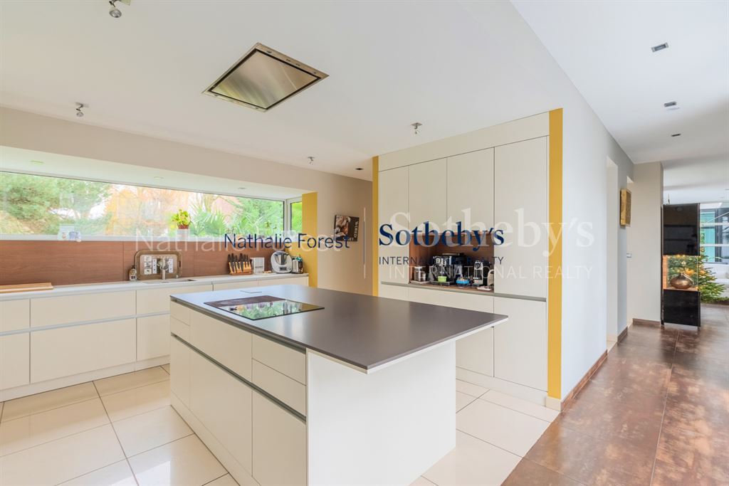 Au Rez-de-chaussée , spacieux hall d'entrée , grand bureau agencé , double Living et salle à manger de 70 m2 avec de très nombreuses baies vitrées coulissantes qui permettent de profiter pleinement du joli visuel sur la verdure ainsi qu'un accès direct sur la piscine couverte grâce à une astucieuse baie vitrée à galandage .