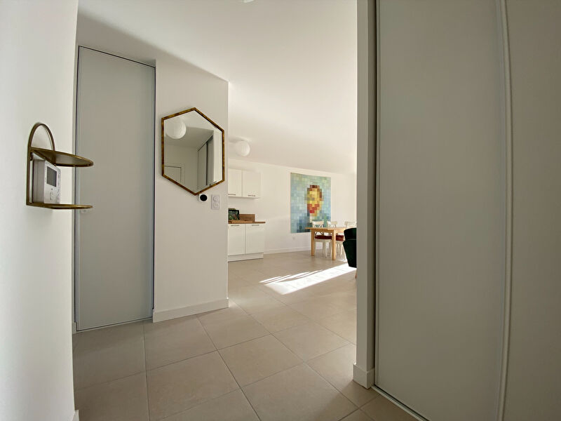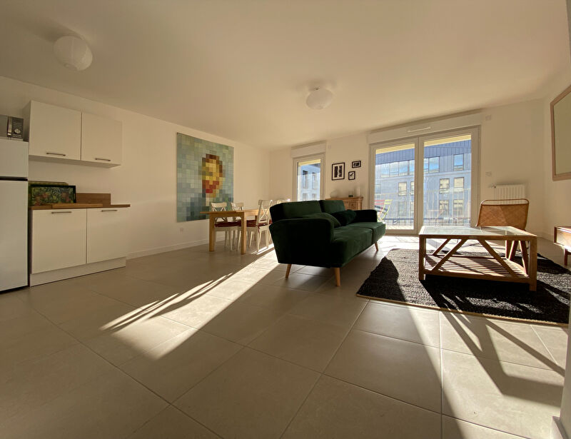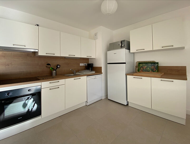 L'entrée avec placard s'ouvre sur un grand séjour/ cuisine d'environ 35m² prolongé de sa terrasse, parfaitement orientés Sud/Ouest. Un couloir dessert la salle de douche, le WC, la buanderie contenant la chaudière gaz individuelle et les deux chambres avec placard.