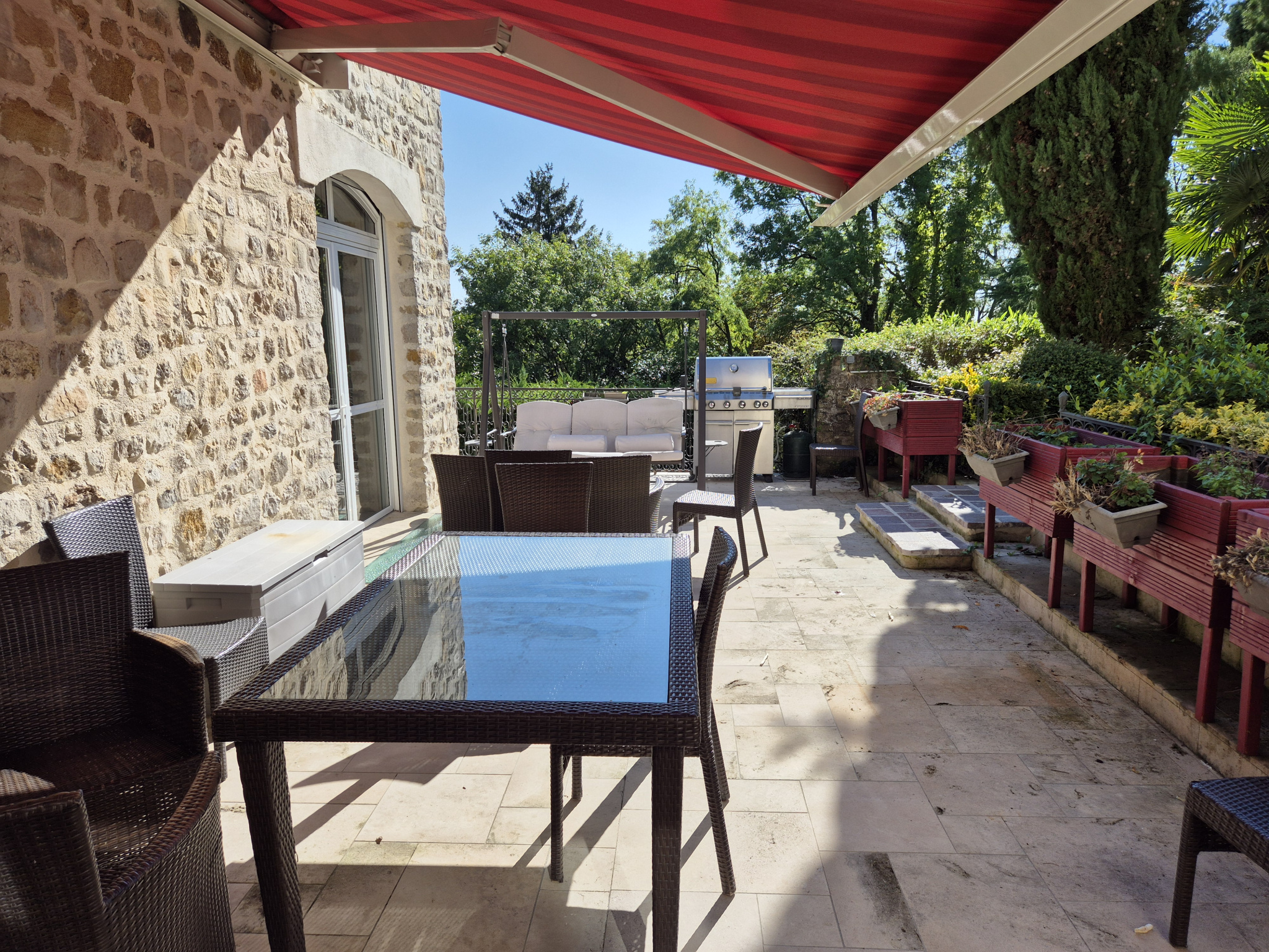 Au coeur d'un village paisible à seulement 5 minutes de Fontainebleau, découvrez cette demeure de charme, entièrement restaurée avec des matériaux de haute qualité et agrandie en 2005 puis rénovée en 2023-2024. Développant près de 400 m2 habitables sur trois niveaux, elle offre des volumes généreux et une vue panoramique sur le massif forestier, accessible directement depuis le jardin. Au rez de chaussée une entrée spacieuse dessert une pièce de vie de 90m2 comprenant une salle à manger agrémentée d'une cheminée Louis XV en bois sculpté avec insert ventilé et un salon donnant sur une terrasse en pavé de pierre blanche d'une surface de 40m2. Une cuisine équipée entièrement refaite en 2023 et son espace repas donnent sur la terrasse. Dans le salon un escalier en pierre permet d'accéder au rez de jardin comprenant une chambre avec salle d'eau et WC, un bureau de 47m2 donnant sur une terrasse pavée et une cave à vin. A l'étage, un large palier dessert 4 chambres, chacune avec salle de bain privative et une suite parentale de 54m2 avec salle de bain et dressing. Tous les sols sont en pierre à calepinages décoratifs avec des cabochons d'ardoise dans certaines parties. Le chauffage, alimenté par pompe à chaleur neuve Viessmann 2023, se fait par le sol. L'installation est pilotable à distance. Les trois étages sont desservis par un ascenseur moderne à double entrée. Elle est assise sur une parcelle de terrain d'environ 1.300m2 accueillant un petit jardin de curé décoré de végétation méditerranéenne ou se trouve une annexe en pierre, le jardin en restanques de trois niveaux joliment décoré de végétation fleurie, de parterres et d'arbres fruitiers. À cela s'ajoute un verger-potager d'environ 400m2 en culture bio avec arbres fruitiers. Deux garages automatisés permettent d'accéder directement à la maison. Un accès à l'autoroute A6 se trouve à 5 minutes ainsi qu'une gare SNCF. Magnifique propriété en excellent état située dans un environnement exceptionnel.
