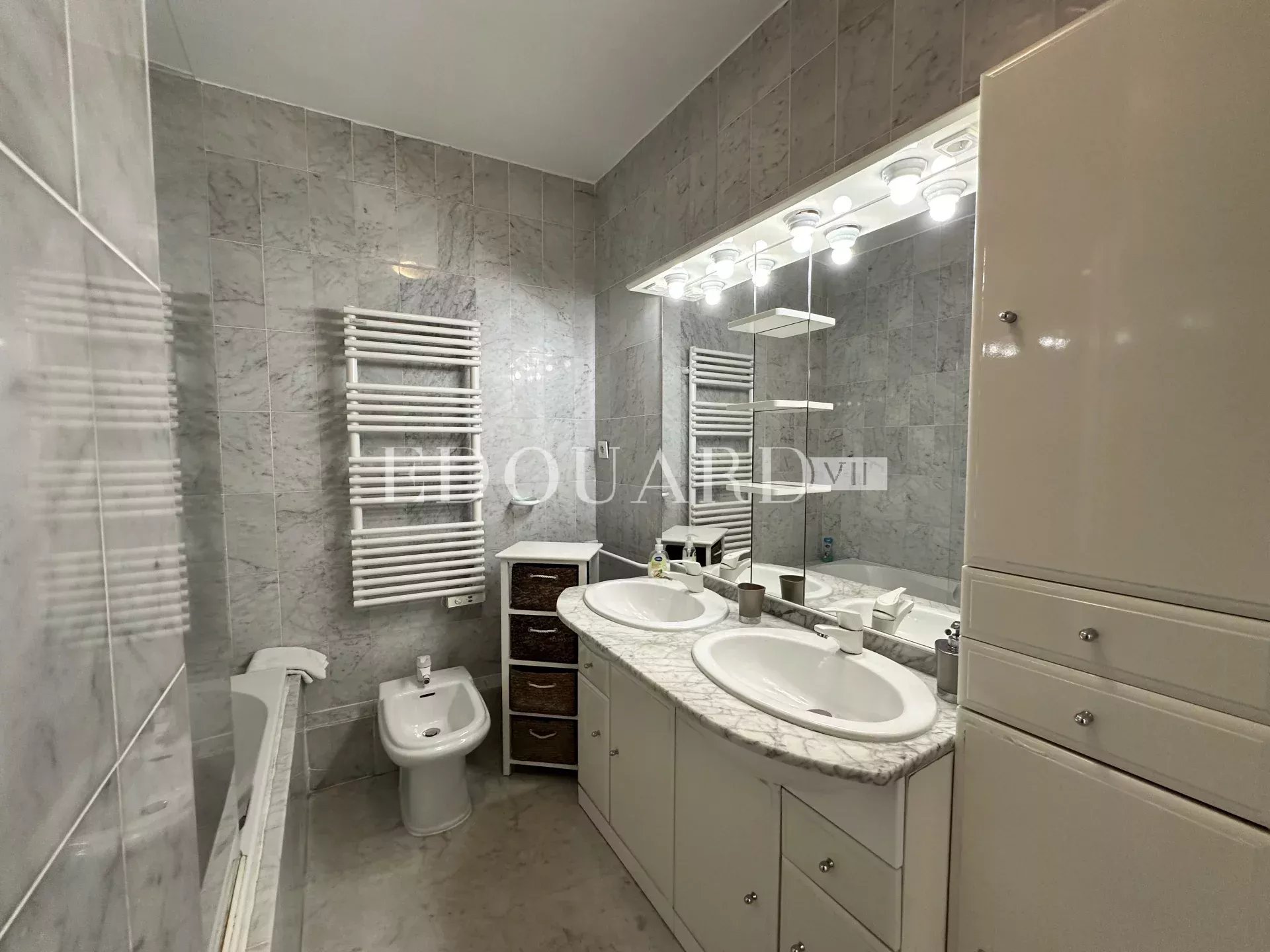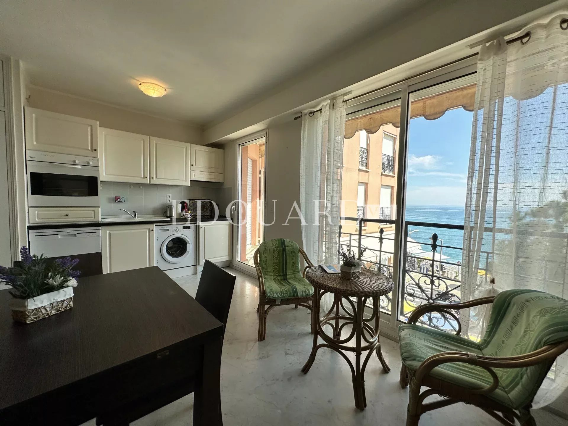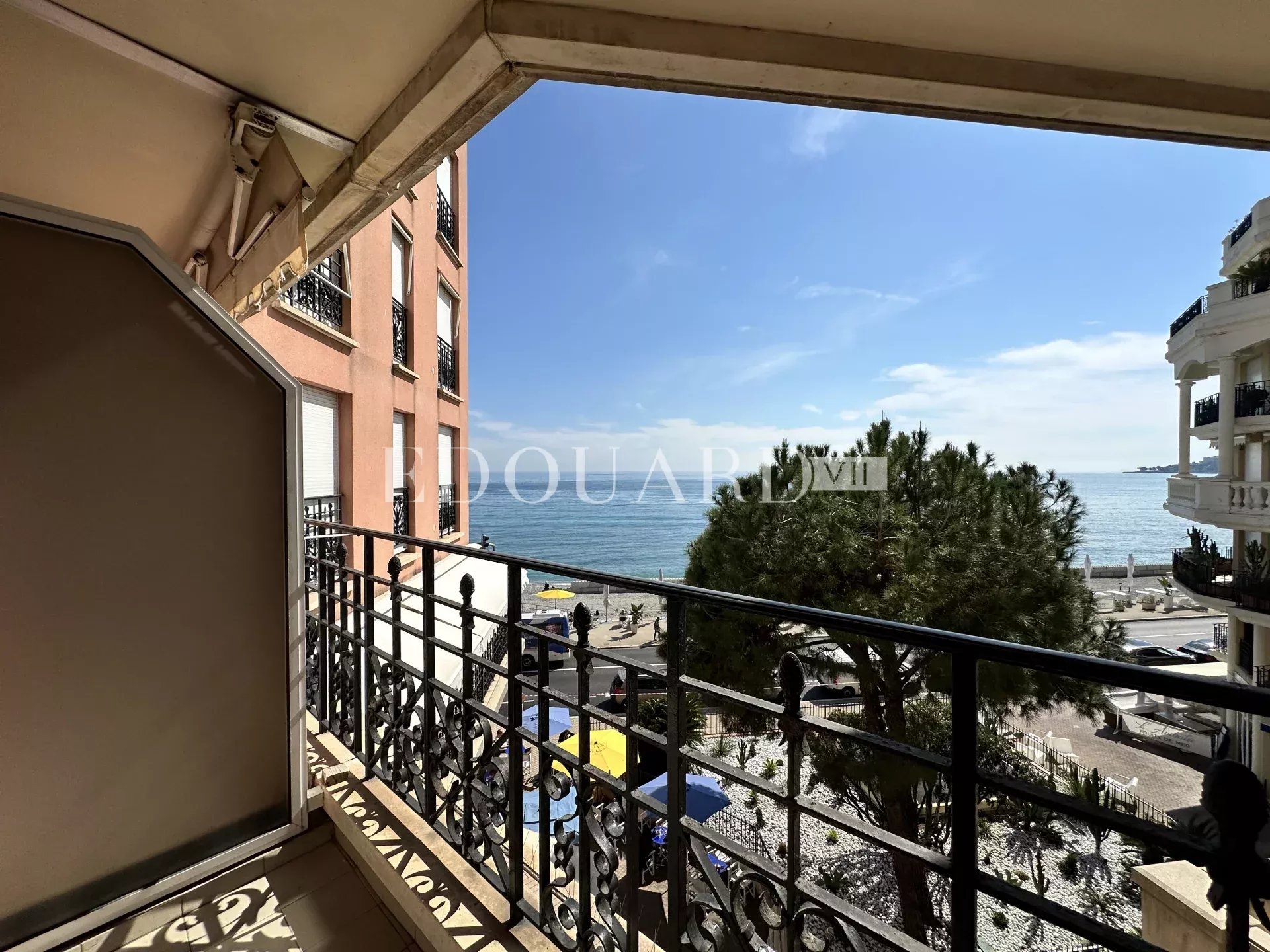 Deux pièces à vendre dans le carré d'or de Menton. Au troisième étage d'une résidence de grand standing avec conciergerie, vidéosurveillance, piscine, sauna et salle de sport, appartement de 53 m² en très bon état avec porte blindée, double vitrage et volets roulants électriques. Composé d'entrée, lumineux séjour avec cuisine américaine équipée (réfrigérateur, congélateur, plaque de cuisson, four, lave-vaisselle, lave-linge), spacieuse chambre avec placard, salle de bains avec WC, 2 m² de balcon exposé Sud-Ouest avec belle vue mer panoramique, cave et parking en sous-sol. Idéalement situé face aux plages, à quelque pas de tous les commerces, du Casino Barrière et du Tennis Club de Menton.
