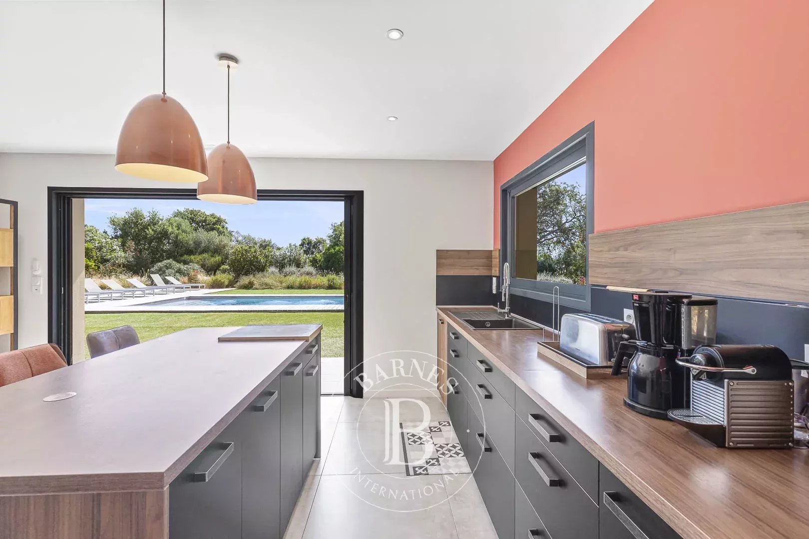 La villa d’environ 145 m², partiellement habillée de pierre, offre une cuisine équipée avec îlot central et une pièce de vie lumineuse ouverte sur une large terrasse.