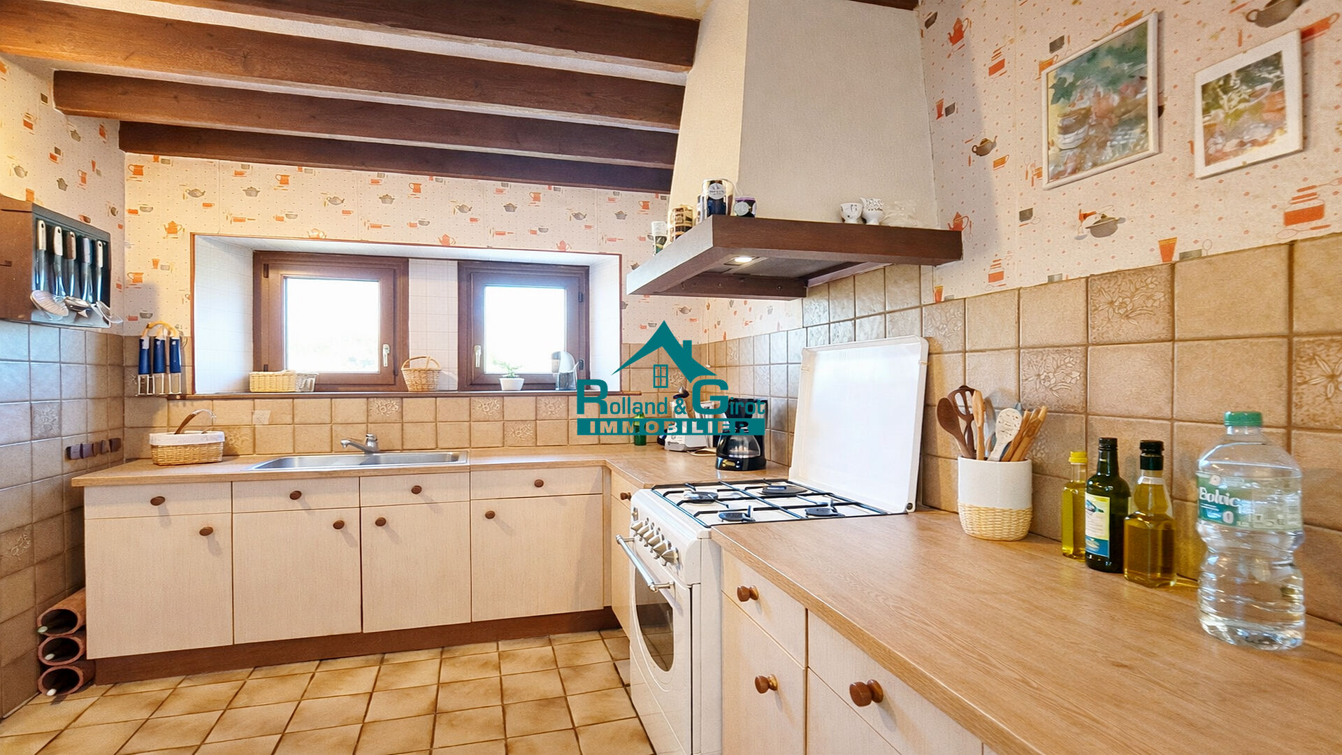 Au rez-de-chaussée, une cuisine aménagée, ouverte sur un salon/séjour avec des poutres et des pierres apparentes et son poêle à granules, vous permettra de passer des moments conviviaux en famille. De l'autre côté de la cuisine, une buanderie avec WC peut encore évoluée en pièce supplémentaire ou bien être aménagée en suite parentale.