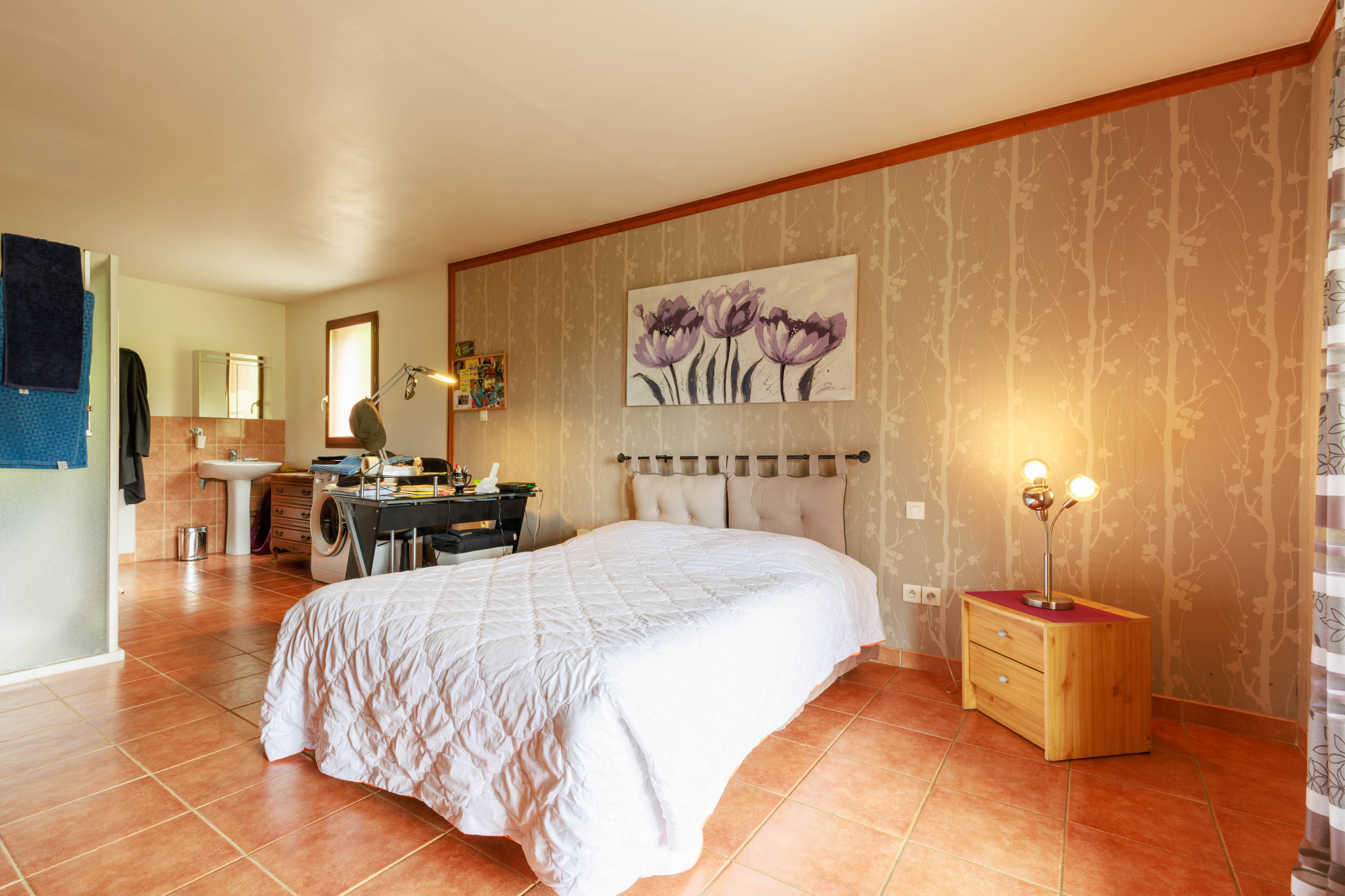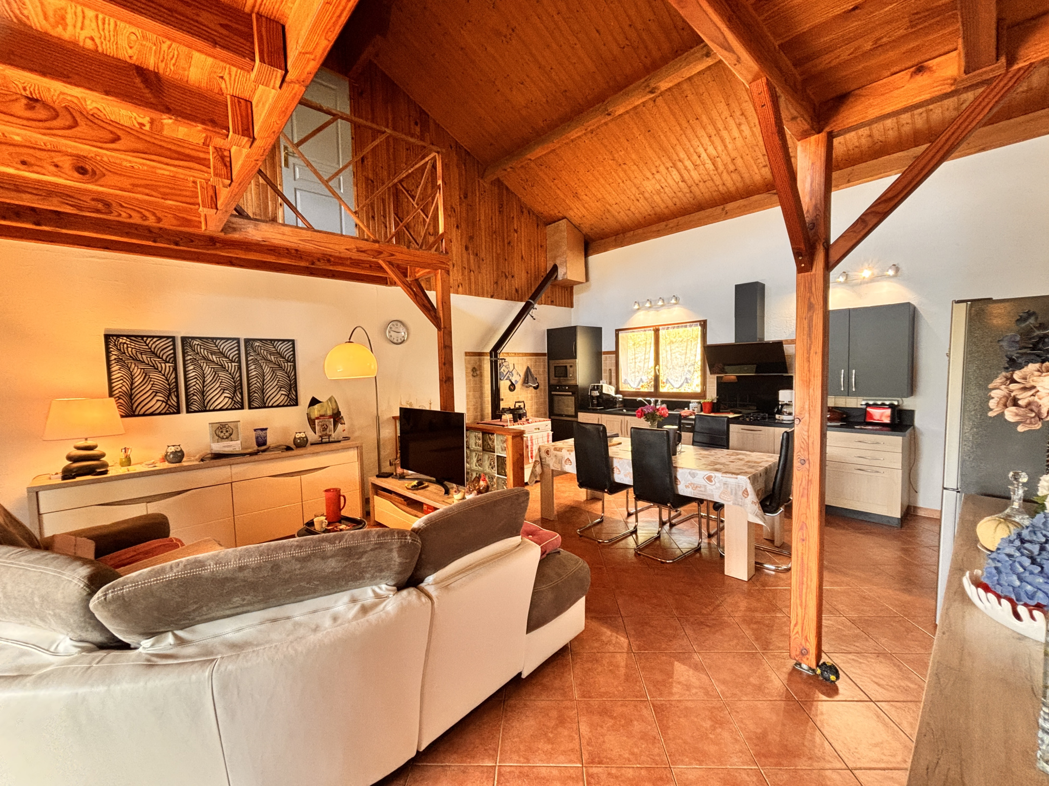 Elle se compose d'un RDC avec une cuisine équipée et ouverte donnant sur un séjour de 40m2 ainsi que de 2 grandes chambres avec salle de bain privative.