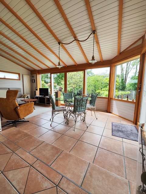 Au rez de chaussée : un grand hall d'entrée avec un placard, une cuisine aménagée et équipée indépendante, une arrière cuisine, une spacieuse pièce de vie avec de belles hauteurs sous plafond, un poêle à bois; une véranda chauffée exposée Ouest, un dégagement, une chambre, un wc avec lave mains, une salle de bains avec baignoire et douche et double vasque,