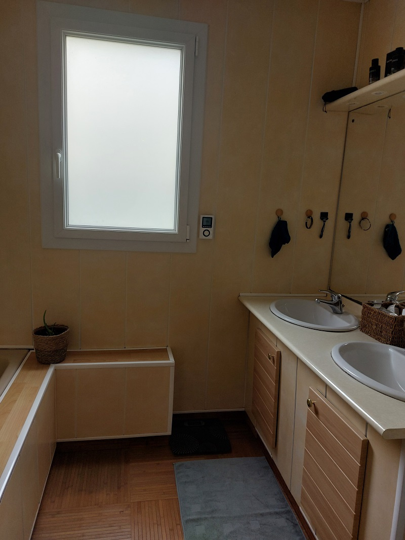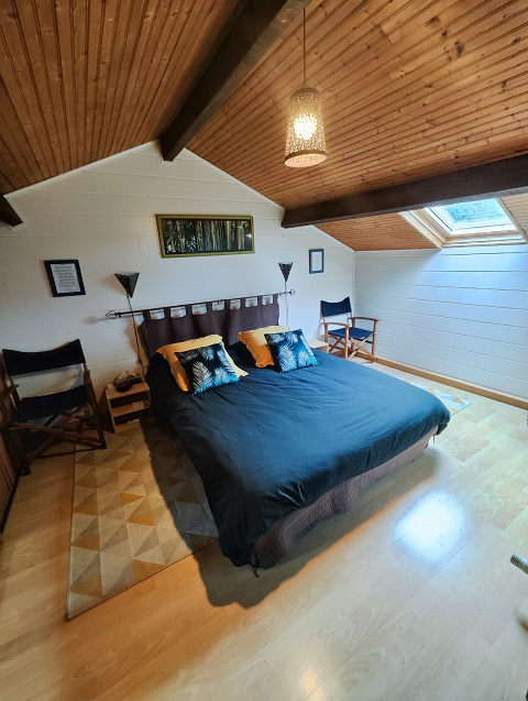 A l'étage : un dégagement, un espace détente ou jeu en mezzanine, deux chambres avec placard dont une avec un coin toilette (vasque), un wc, un bureau.