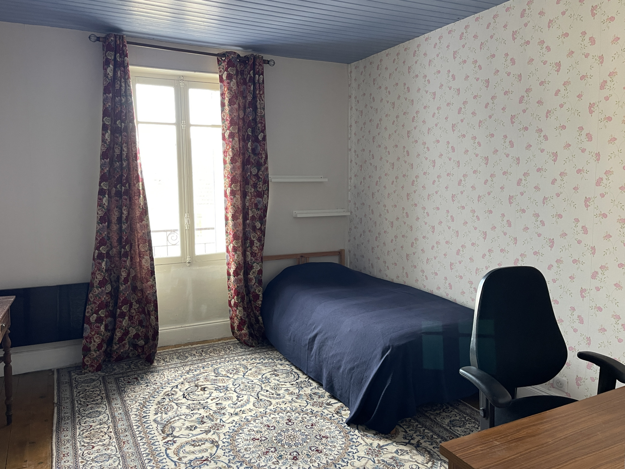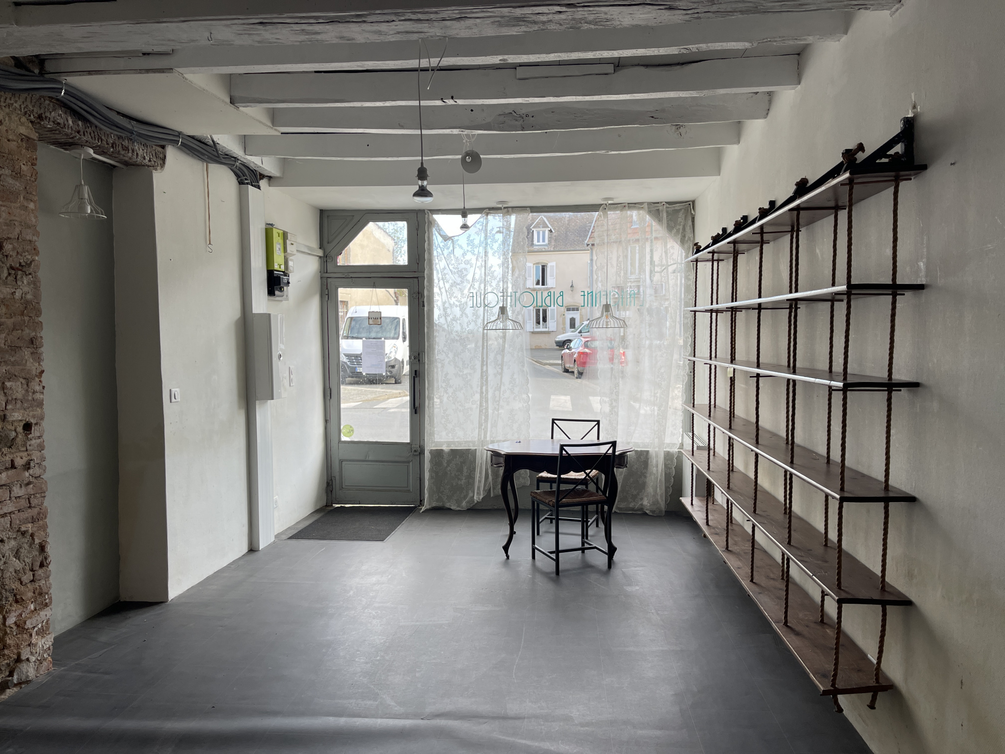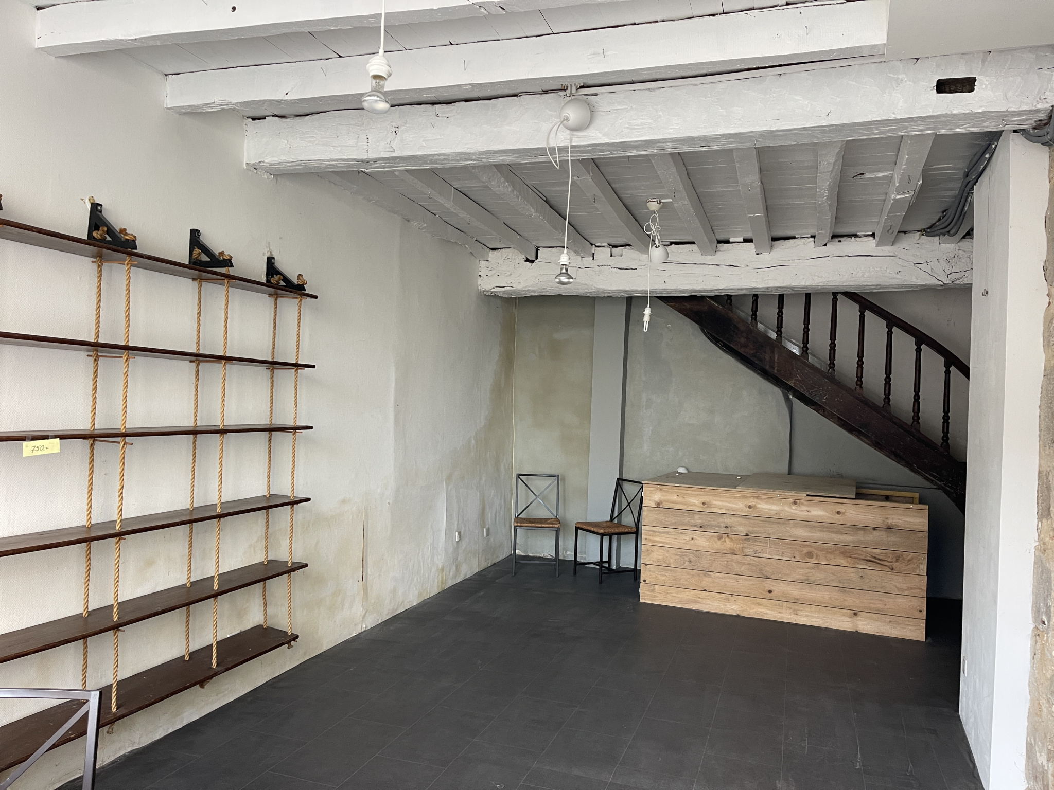 Auv 1141 : Maison de village habitable de 3x30m2, grenier, cave Cette maison était à l'origine en bas une bibliothèque, un magasin, etc. et en haut un appartement. Bien sûr, la totalité peut également être utilisé comme une maison spacieuse. Chaque étage a un peu plus de 30m2 et le grenier est complètement isolé, avec une pièce supplémentaire de 10m2 de hauteur au-dessus de 1m80 et une surface au sol beaucoup plus grande. L'aménagement intérieur et l'installation électrique ont été refaits au cours des 8 dernières années, les fenêtres sont encore d'origine en simple vitrage. La maison est en fait très bien agencée. Au rez-de-chaussée, il y a une grande pièce de 30m2 avec plafond en poutres apparentes, à l'arrière l'escalier menant à la cave sous tout le bâtiment, et il y a aussi un cabinet de toilette séparé avec toilette suspendue et lavabo pour être conforme à un magasin. Au premier étage, il y a une grande cuisine-salon avec un bloc cuisine, un poêle à bois et du chauffage électrique. Des portes doubles en verre donnent accès à un balcon suffisamment grand pour s'y installer avec des chaises. Comme il y a une rue en face et pas de maisons, la vue est dégagée et on peut même voir le paysage verdoyant de la région tout en étant au milieu du village. Agréable ! Le deuxième étage dispose d'un hall (5,3m2) qui donne accès à la chambre (15m2, hauteur sous plafond de 2m65) avec une grande fenêtre côté devant, une cheminée et un chauffage électrique. La salle d'eau spacieuse et entièrement rénovée (10m2) avec douche à l'italienne, meuble vasque, toilette suspendue et bidet est accessible séparément par le hall. Dans ce hall, il y a également le bel escalier en bois menant au grenier aménagé avec 2 Velux.