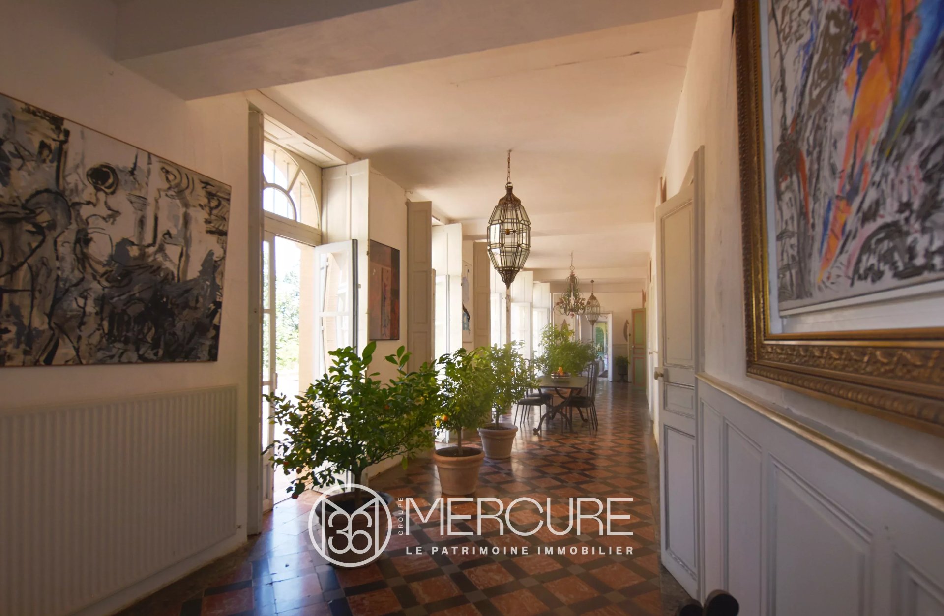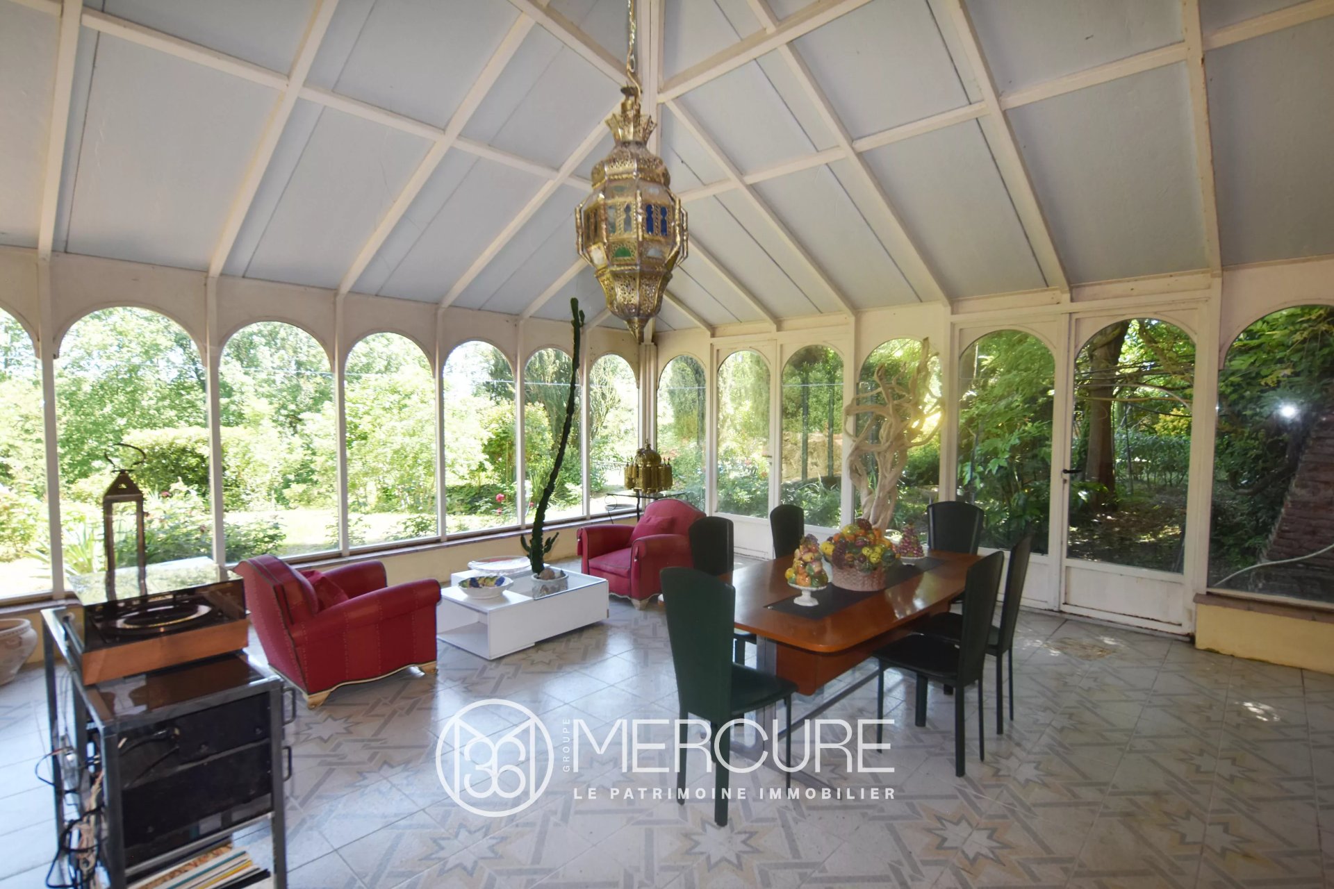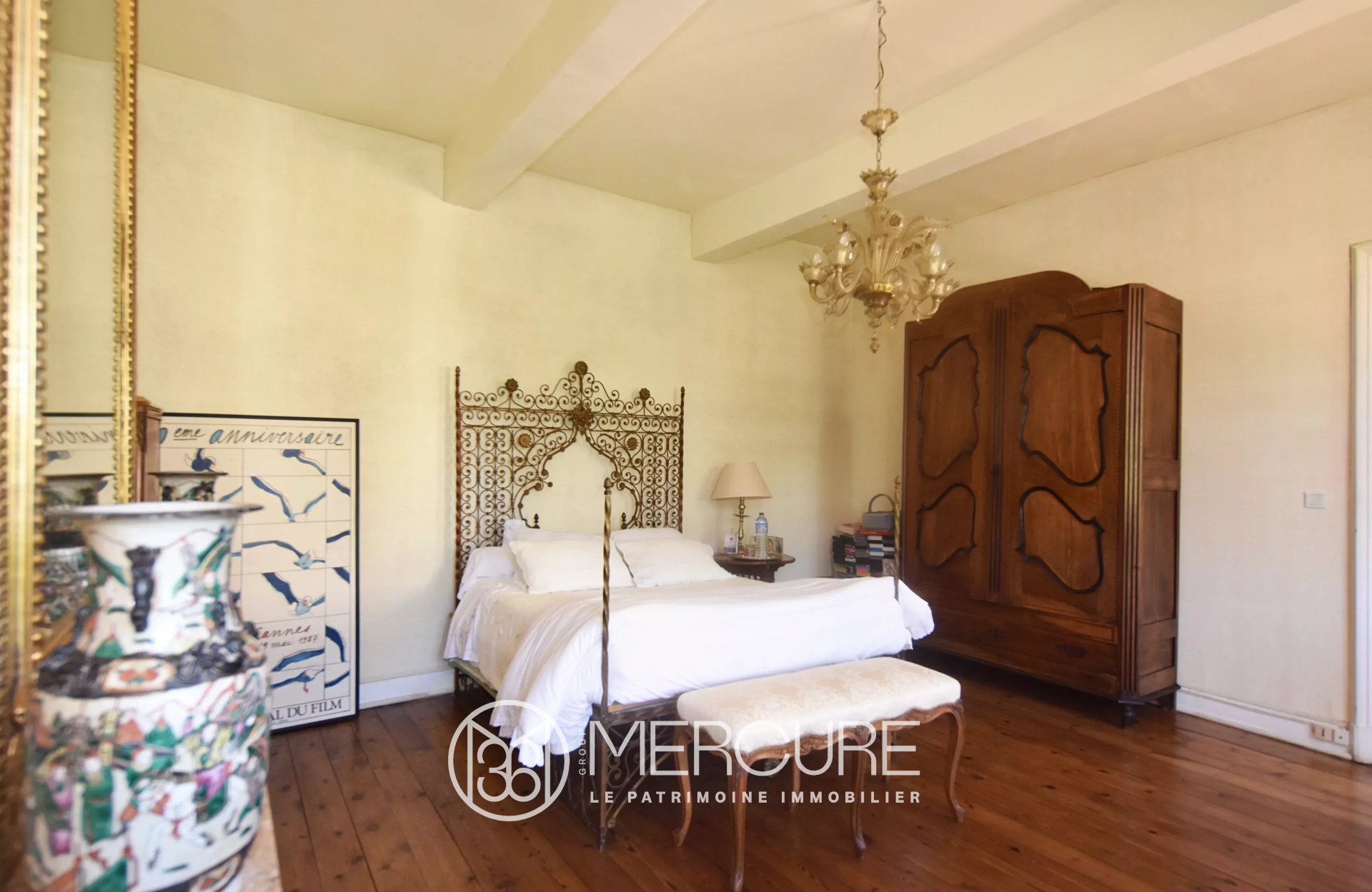 Une grande terrasse carrelée en tomettes surplombe un magnifique parc arboré sur 1,30 ha environ. A l'ouest de la propriété, une piscine filtrée au sel est bordée par un pavillon en briques qui pourrait constituer un spacieux pool house.