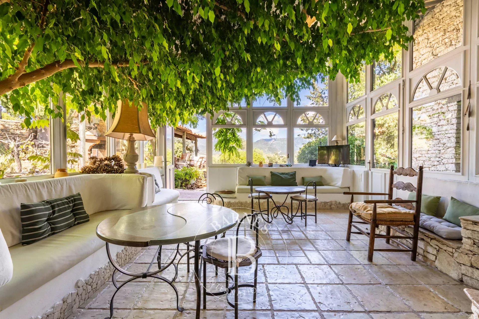 La propriété se compose de 3 bâtiments recouverts de pierres au style bergerie. Elle dispose d'un vaste salon agrémenté d'une cheminée traversante, d'une grande bibliothèque et d'un coin piano. Une cuisine, une salle à manger ainsi qu'une lumineuse salle de réception entièrement vitrée avec cheminée.