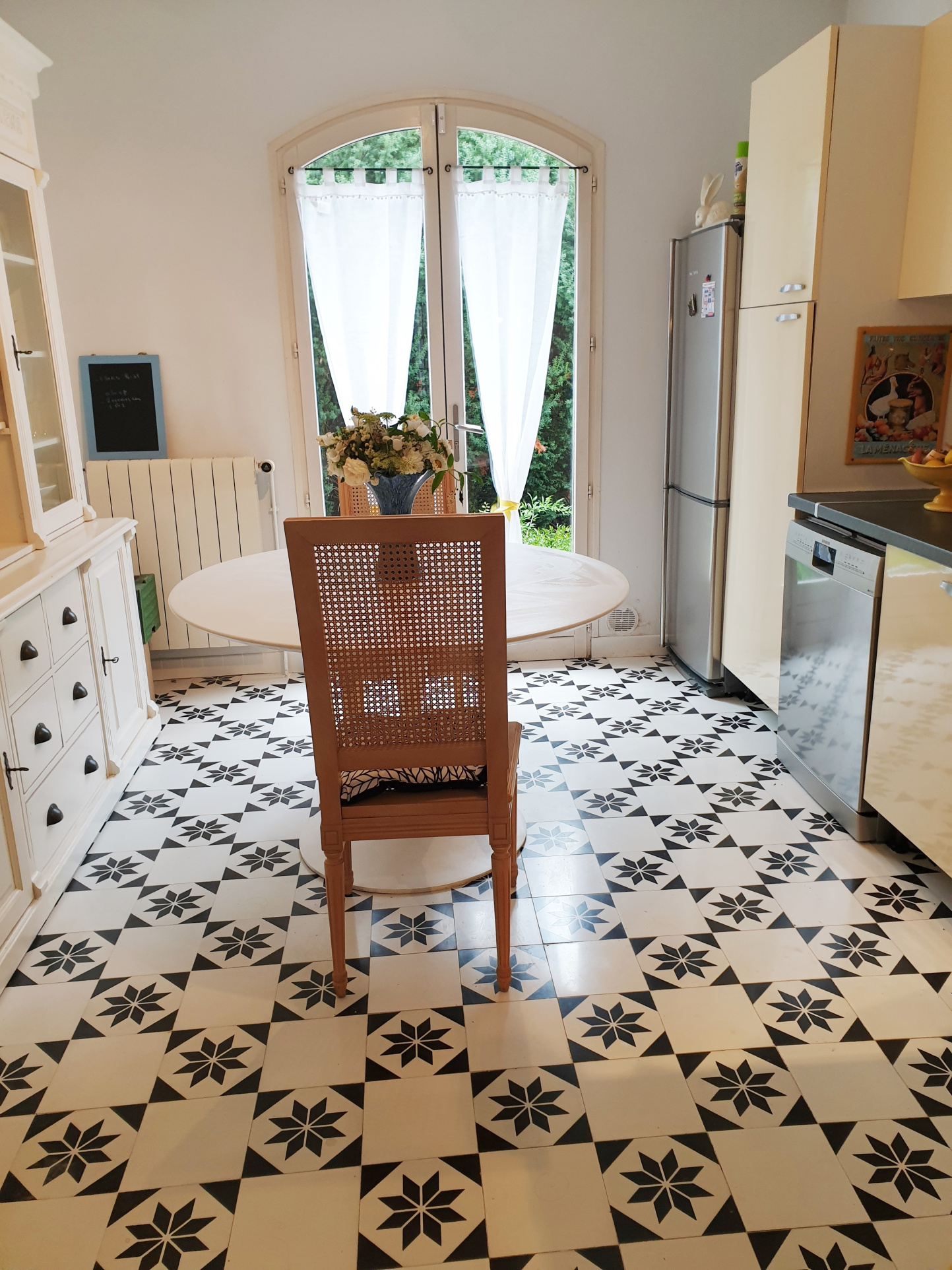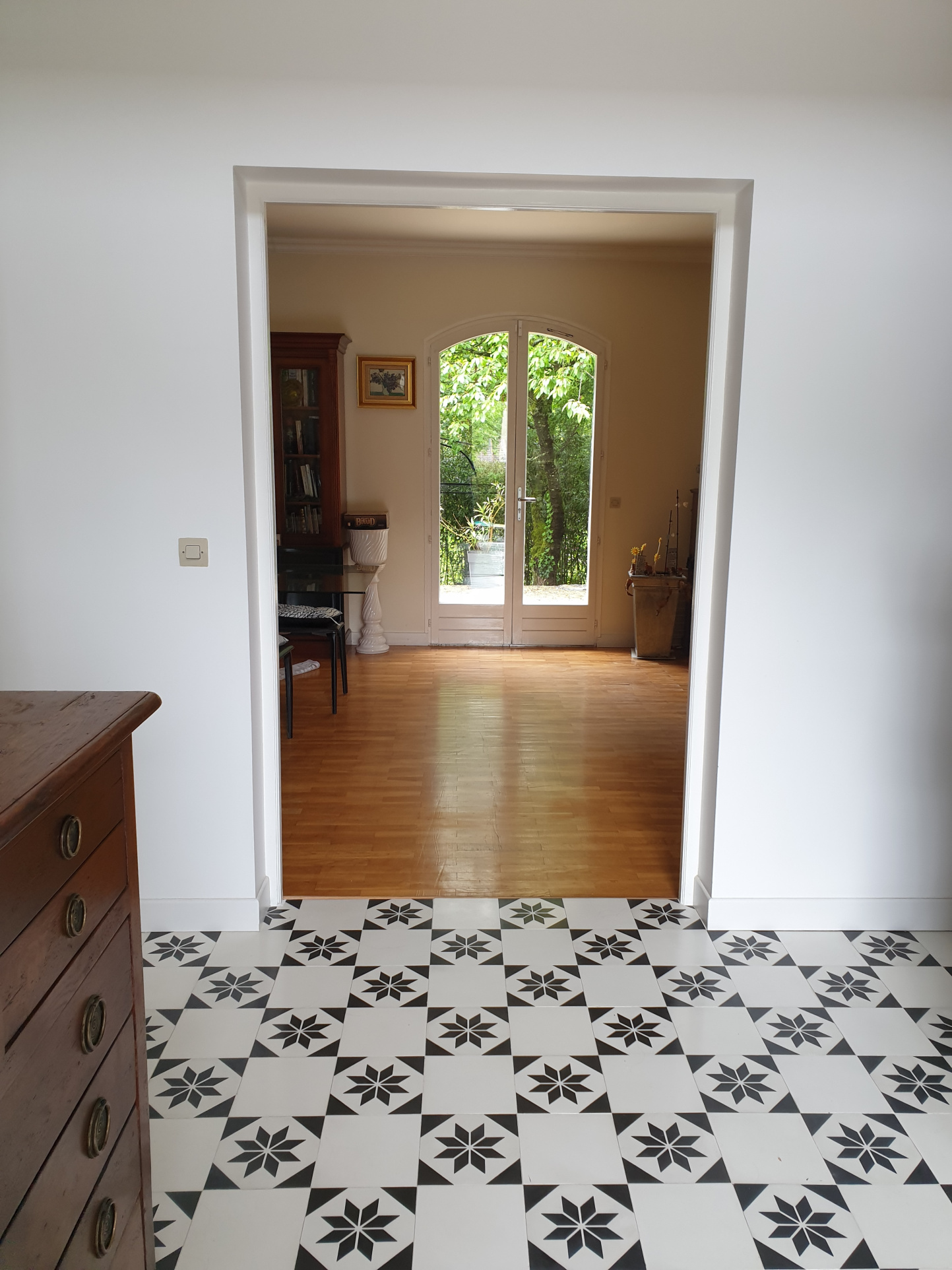 Vaste entrée avec carreaux ciment, grand séjour avec cheminée donnant sur une terrasse et le jardin, cuisine équipée, bureau, salle de bain, wc séparés.