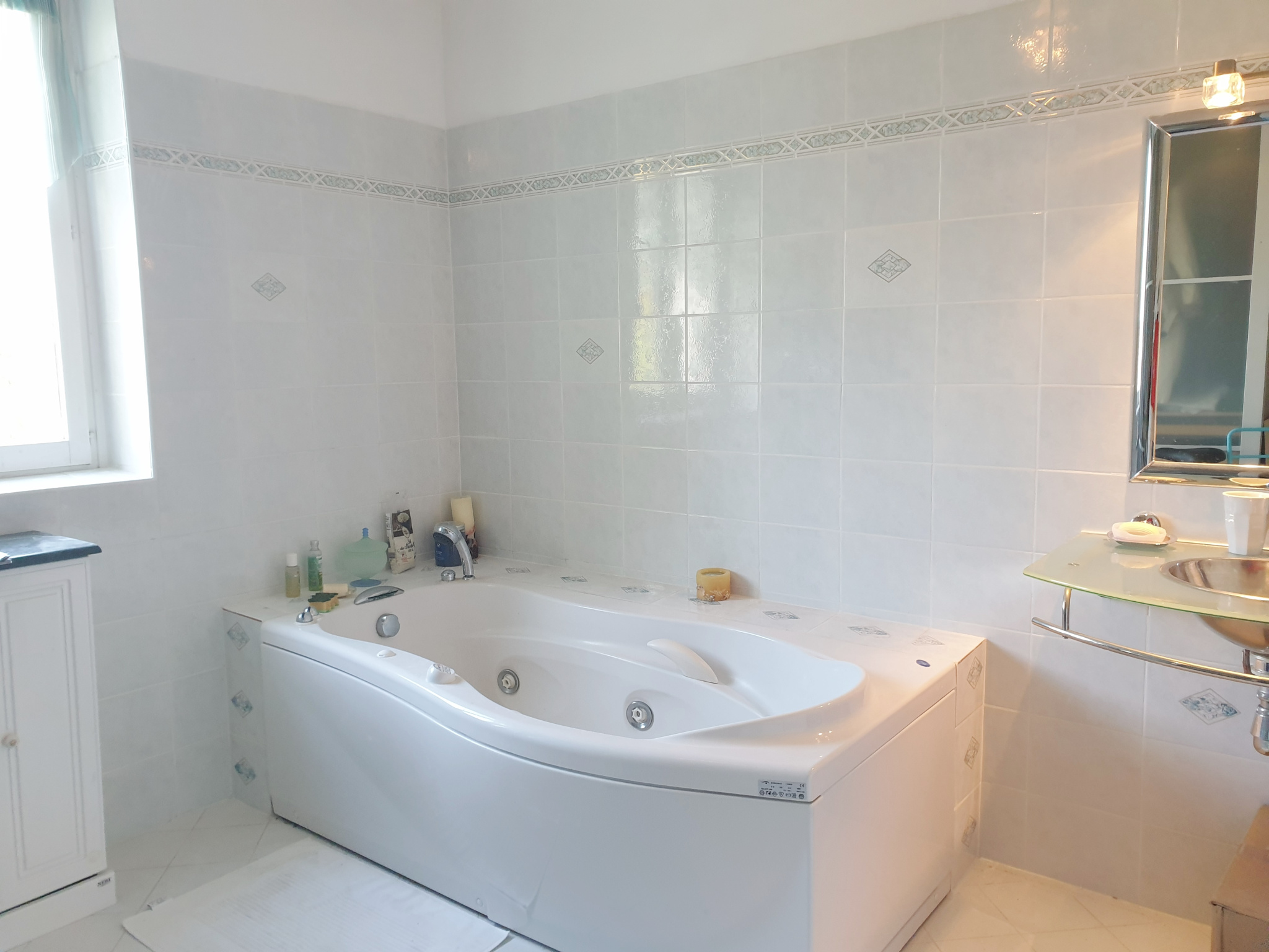 A l'étage : 3 chambres, salle d'eau, suite parentale avec baignoire balnéo.