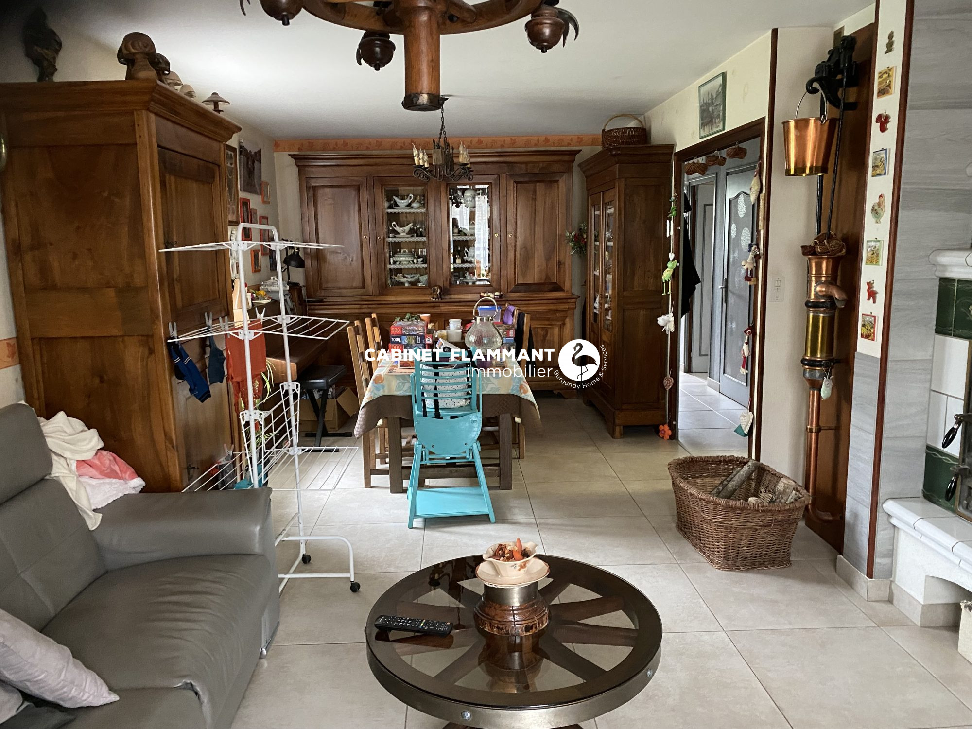 La maison est composée comme suit: une montée d'escalier donnant sur un balcon/terrasse ouvrant en RDC sur une entrée, une cuisine équipée/meublée, un séjour avec un poêle Alsacien de masse, ce salon ouvre avec une porte fenêtre sur le balcon contournant.