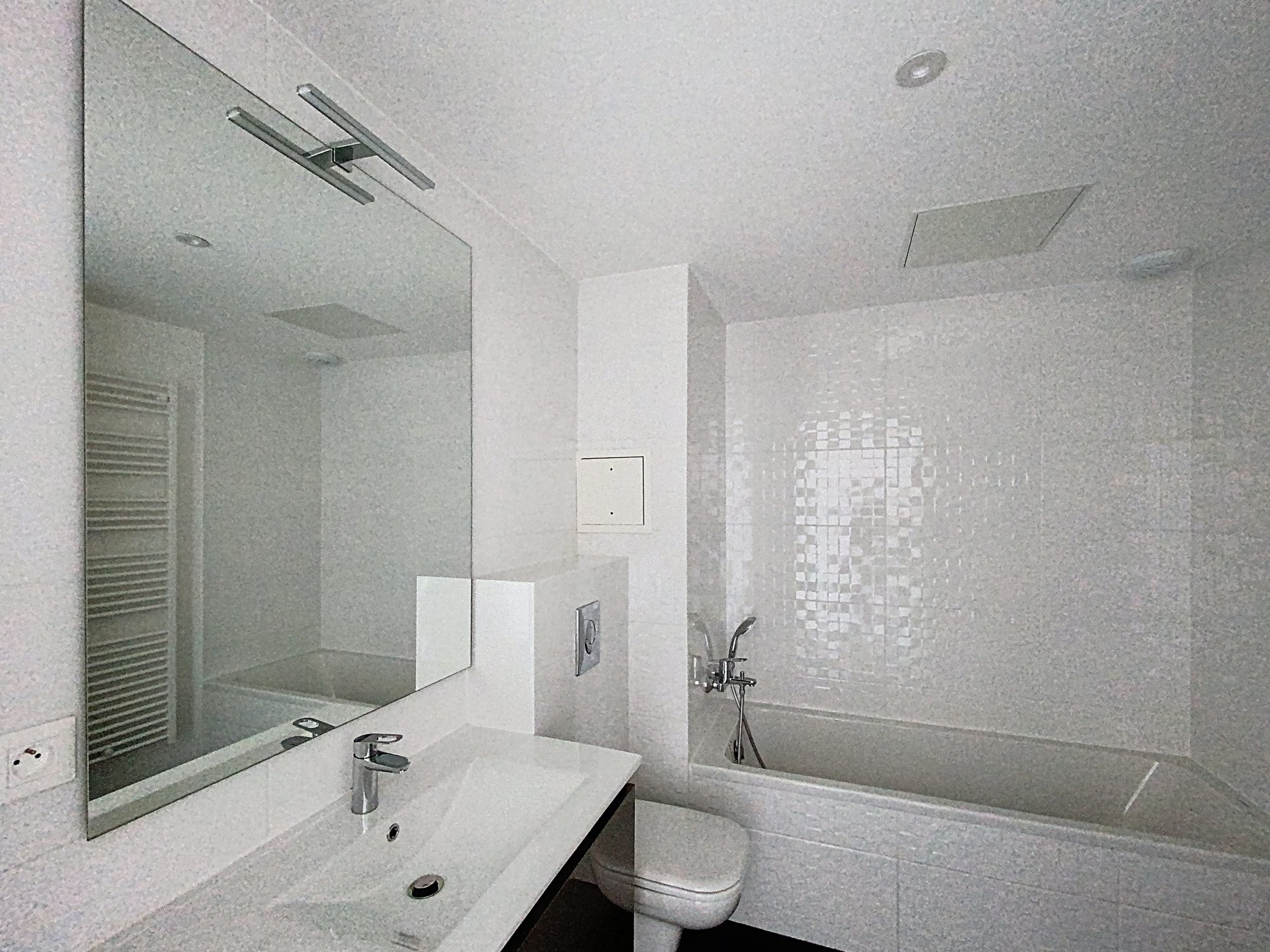 Appartement 5 pièces de 105 m² au 1er étage très lumineux comprenant : une entrée, un WC séparé avec lave-mains, une cuisine ouverte sur le séjour donnant accès à la belle terrasse de 18 m² , un dégagement desservant 4 chambres, une salle d'eau équipée avec douche à l'italienne, meuble vasque et sèche serviette et une salle de bains (baignoire, WC, meuble vasque et sèche serviette).