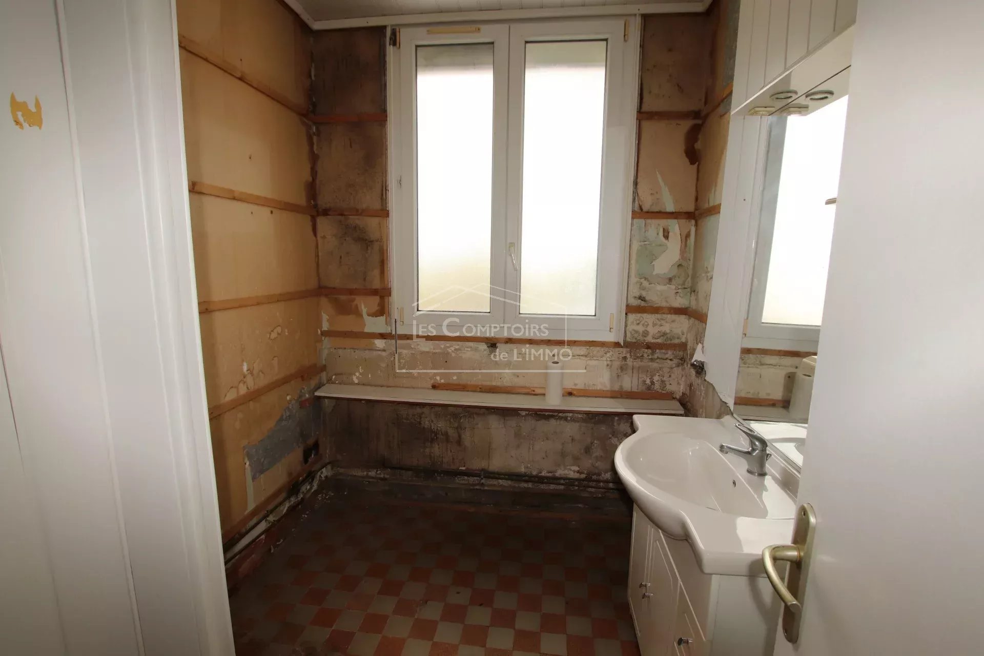 Appartement à rénover avec possibilité de 5 ou 6 chambres. Comprenant entrée, cuisine, 2 toilettes, séjour avec cheminée, salle d'eau, 2 chambres et grenier aménageable desservi par un escalier et permettant de créer 4 chambres et une salle d'eau. Toutes les huisseries sont en pvc.