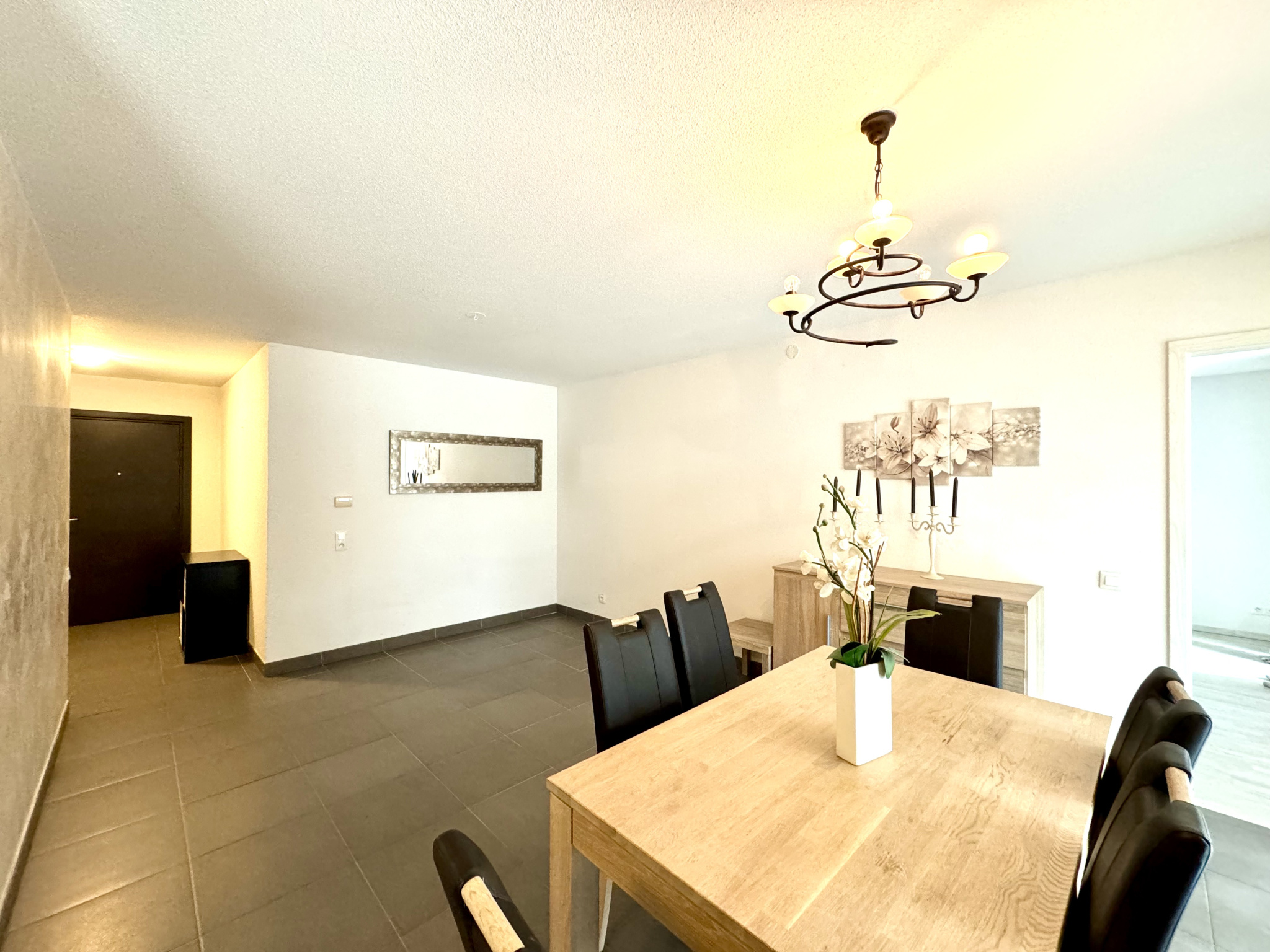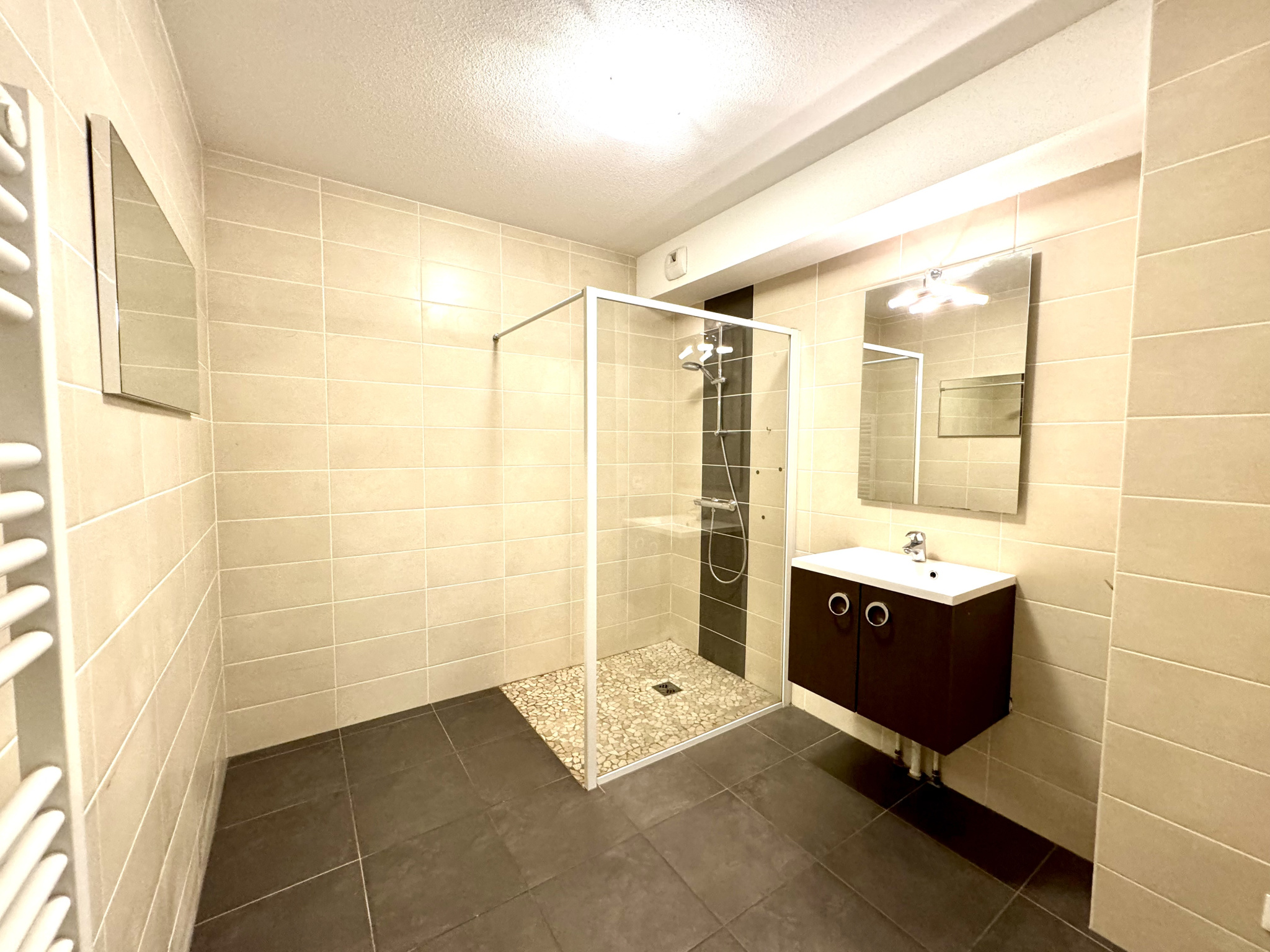 Une belle entrée avec un placard desservant la pièce de vie principale comprenant une jolie cuisine totalement équipée et le salon séjour donnant accès à une spacieuse terrasse couverte de 22.73m2 exposée sud-ouest, une grande salle de douche de 6.15m2 (une douche à l'italienne, un meuble vasque, un sèche serviettes et l'emplacement pour la machine à laver), un wc séparé avec un lave mains ainsi que 2 chambres (actuellement en enfilade avec possibilité d'avoir une entrée indépendante pour chacune).