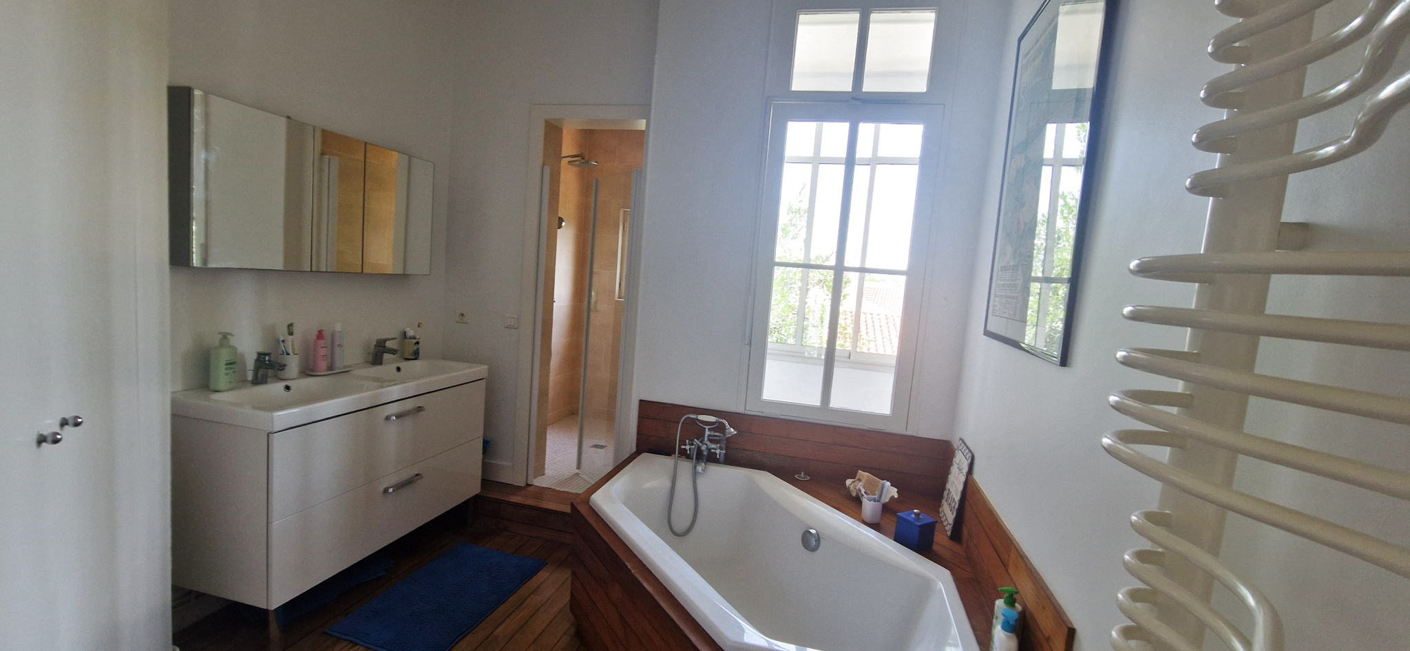 La grande salle de bain est pensée pour le confort de toute la famille, avec baignoire et douche.