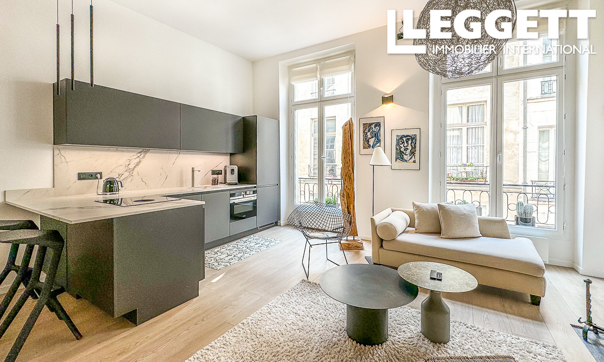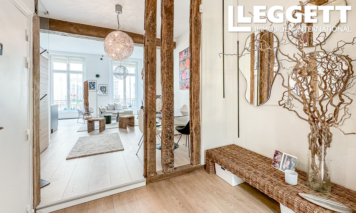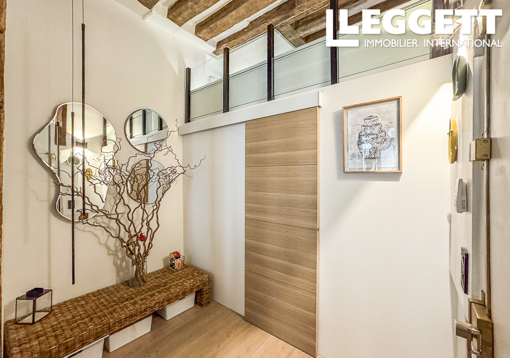 A28150HHE75 - Dans un immeuble de 1650, niché dans une rue secondaire tranquille, découvrez cet appartement magnifiquement rénové au deuxième étage. L'entrée spacieuse de 13 m² dispose de rangements sur mesure et d'une mezzanine. La superbe pièce principale ouverte (31 m²) offre une hauteur sous plafond de 3,4 mètres, une cheminée en marbre, des poutres du XVIIe siècle et une cuisine américaine équipée moderne. Une salle de douche avec WC (3,5 m²) et une mezzanine optimisent l'espace.