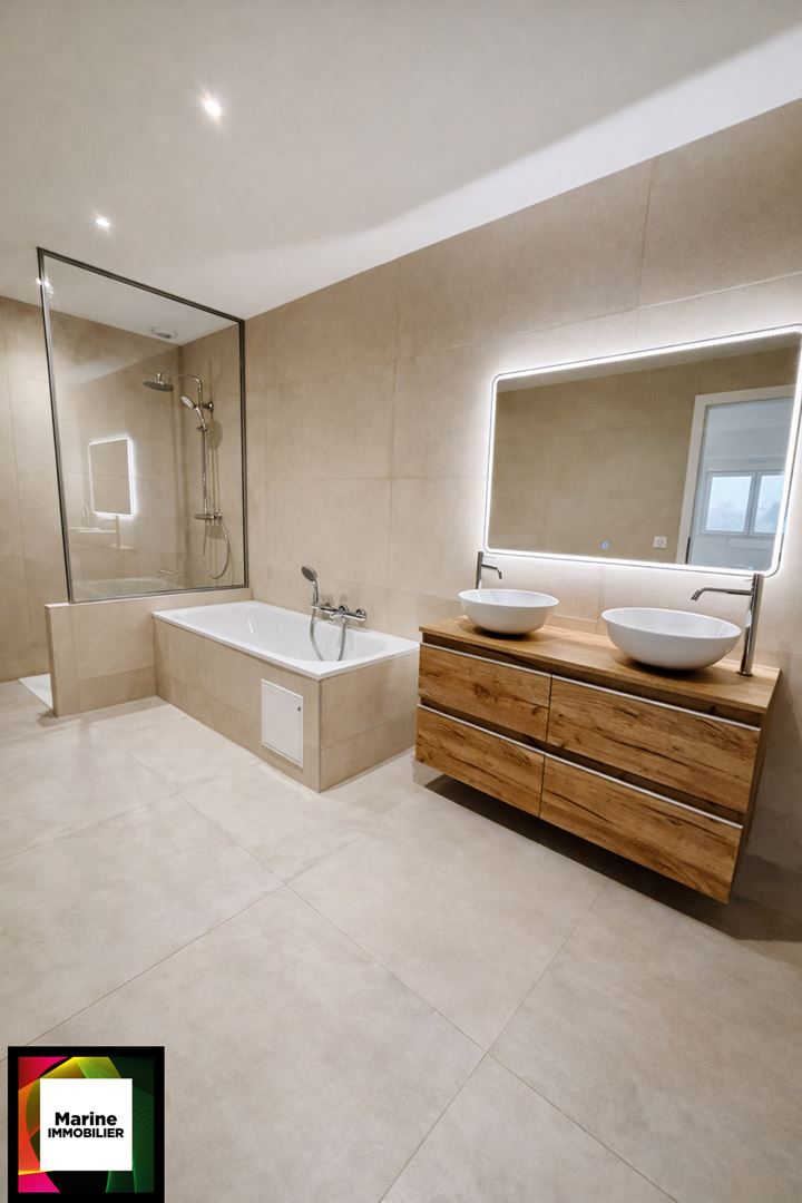 La salle d'eau est équipée d'une douche avec bac extra-plat de 90/120, double vasque meublée et miroir de votre choix, et un toilette indépendant avec lave-mains.