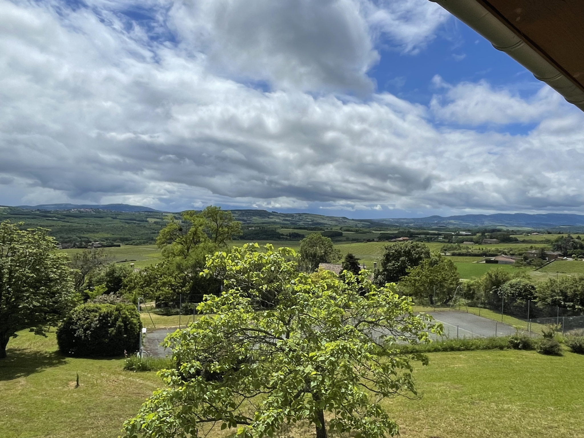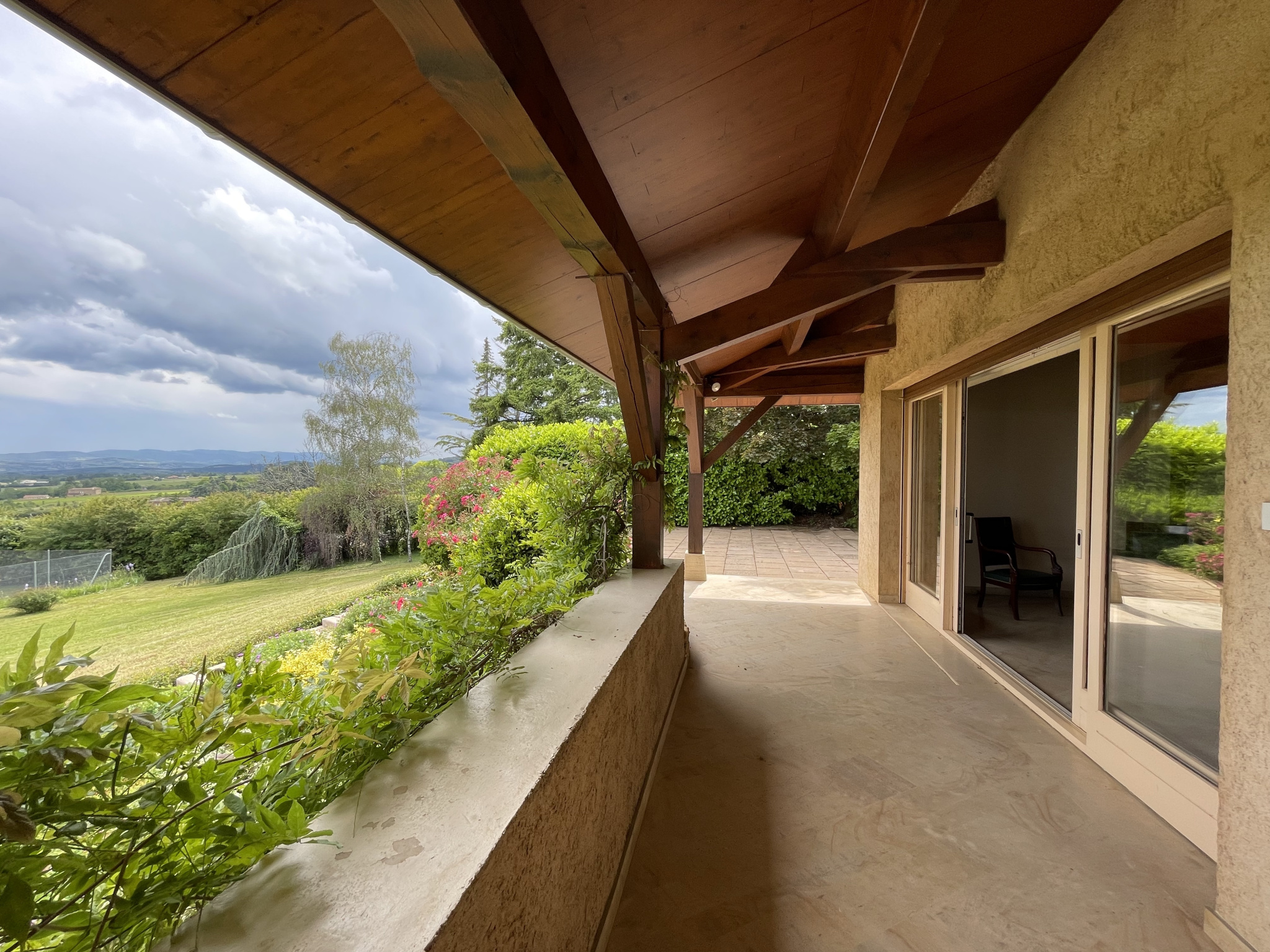 Exclusivité - Pierrefeu immobilier vous propose à la vente, sur la commune de Theizé, secteur Le Sarroux, cette villa d'architecte de 1978 d'une surface habitable d'environ 212m2 élevée sur sous-sol complet (+80m2). Dans un environnement bucolique et calme, la propriété comprend de plain-pied : une entrée, un vaste séjour avec cheminée centrale et vue panoramique sur la vallée, une cuisine séparée (ouverture possible), 2 chambres, 1 salle de bains avec douche et un wc indépendant. Au 1er étage, vous trouverez un dégagement qui dessert 4 chambres avec vue et placards intégrés, 1 salle de bains avec douche et un wc indépendant. Le sous-sol (semi enterré) d'une surface totale d'environ 82m2 se compose d'une buanderie, d'une cave, d'une chaufferie (Chaudière fioul), d'un wc, d'un garage double (45m2) et de nombreux espaces de rangement. Un magnifique parc paysager et clos de 5000m2, avec piscine 10x5m, un cour de tennis, un abris bois et un carport complètent le bien. De très belles prestations pour ce bien de qualité. Des travaux de rénovation sont à prévoir en (assainissement, électricité, etc.). Division parcellaire non envisageable (zone Agricole). Annexe possible (CES 50m2). Notre avis : Environnement bucolique, Calme, Absence de vis-à-vis, Vue panoramique, Construction de qualité, Proximité A89 (12km/15mn). Visites et renseignements : Muriel Chauplannaz - Agent commercial de la SARL Pierrefeu Immobilier - Immatriculée au R.S.A.C de Lyon sous le numéro 843 741 570.