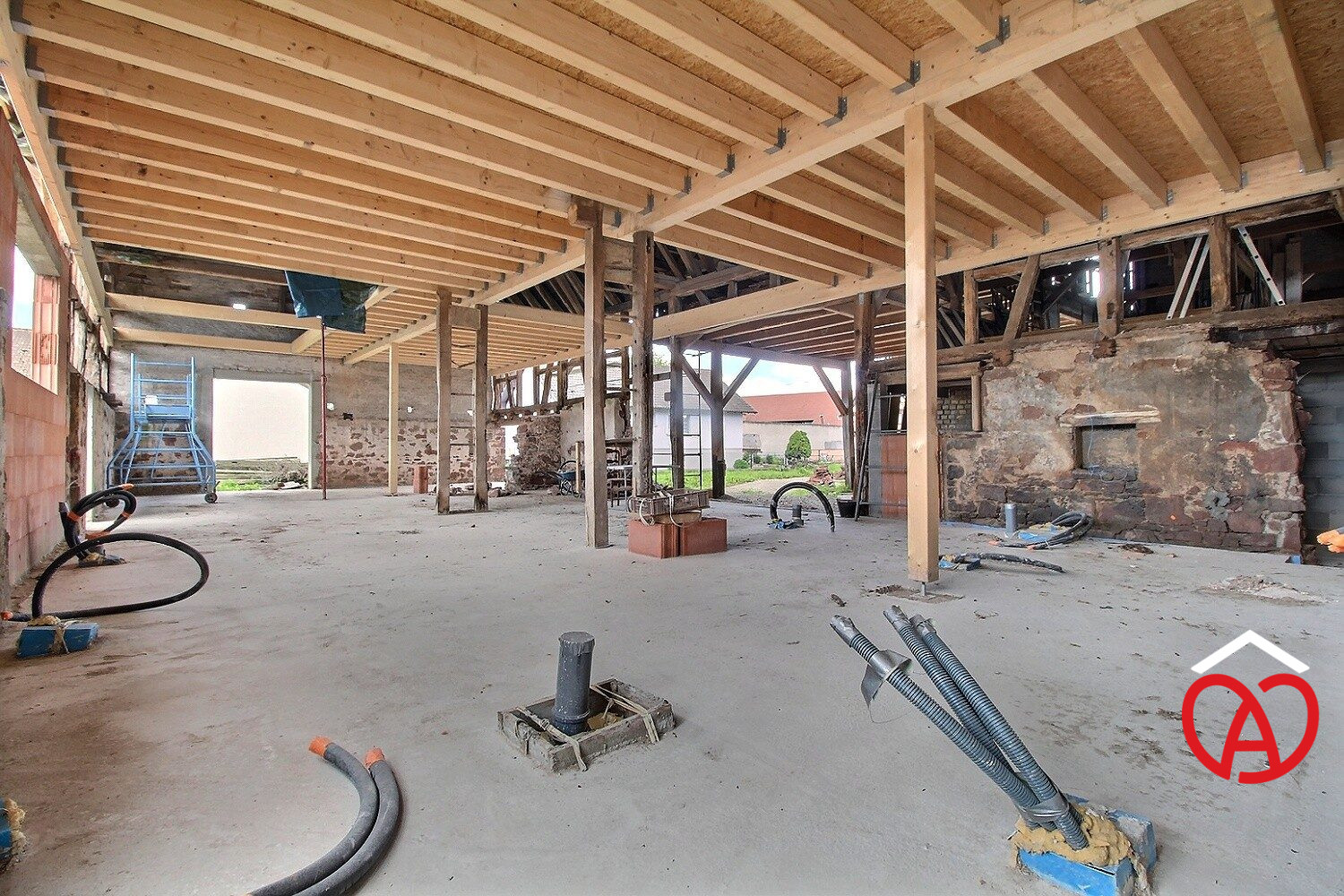 Elle est composée d'un grand volume de 216 m² sur deux niveaux destiné à l'habitation ainsi que des espaces complémentaires de type garages, ateliers ou stockage d'une superficie de 100 m² au sol (des combles existent également sur cette partie du bâtiment)
