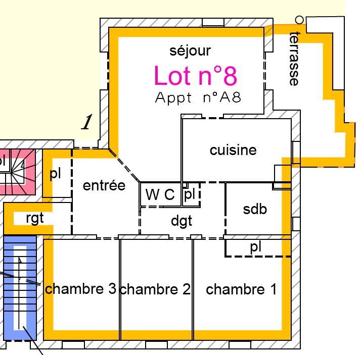 Au 1 Allée des Gléneaux à Montreuil-Juigné, appartement (lot n°8) de 88m² situé au rez-de-chaussée et comprenant entrée avec placards, séjour avec terrasse, cuisine séparée à aménager et équiper, dégagement avec placard, WC séparé, 3 chambres dont une avec placard, salle de bains. Chauffage individuel au gaz, DPE: C.
