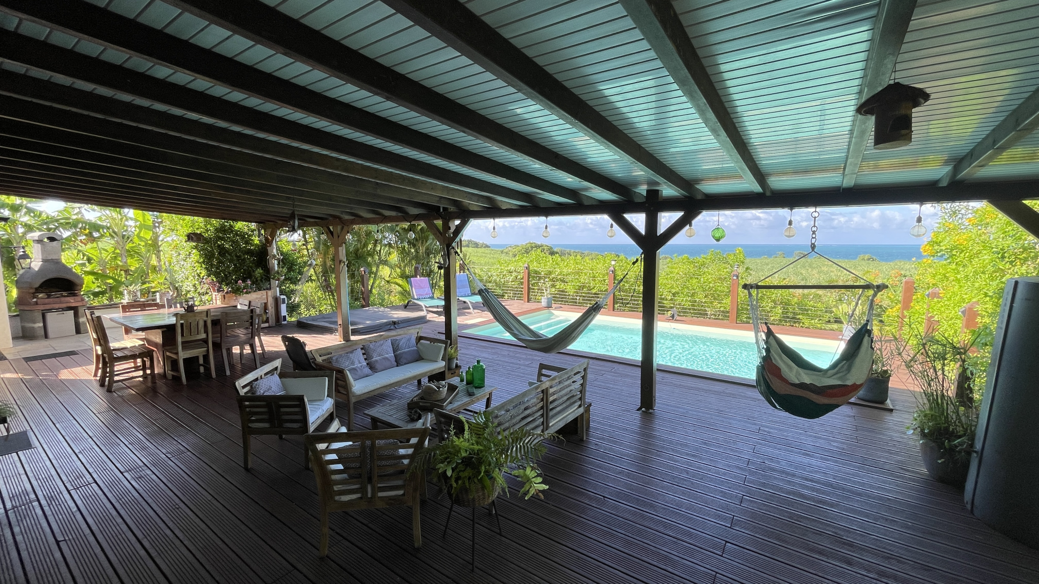 SAINTE ROSE - Au calme d'un quartier très apprécié, proche des plages et des belles randonnées ! Vous tomberez sous le charme de cette villa édifiée en bois exotique et parfaitement entretenue. Tout est de bon gout et les matériaux de belle qualité. L'arrivée se fait à l'abris des regards et vous entrez dans un écrin de verdure souligné par la mer des Caraïbes... Cette parcelle de 1650 m2 est close avec portail électrique, avec encore un potentiel de construction pour une dépendance et/ou autre car port, un abri de jardin est déjà présent. Vous accédez à la villa grâce a un superbe deck encadrant la piscine et son jacuzzi. L'ambiance y est douce, et conviviale, grâce au comptoir ouvert sur la cuisine qui est aménagée et bien équipée ! De plus vous y trouverez un cellier et une porte d'accès extérieur pour un coté pratique. Le séjour est spacieux, toujours ouvert sur la terrasse et donne accès à une première chambre d'invité (ou bureau) ... Vue mer. Ensuite un dégagement nous entraine vers deux chambres, une salle d'eau et des toilettes indépendants. Pour finir, la chambre parentale qui est spacieuse avec sa salle de bain, avec baignoire d'angle, pour des réveils en douceur. La villa est vendue avec son mobilier en bois de teck de Guyane. Pour en saisir tout le charme une visite est impérative !