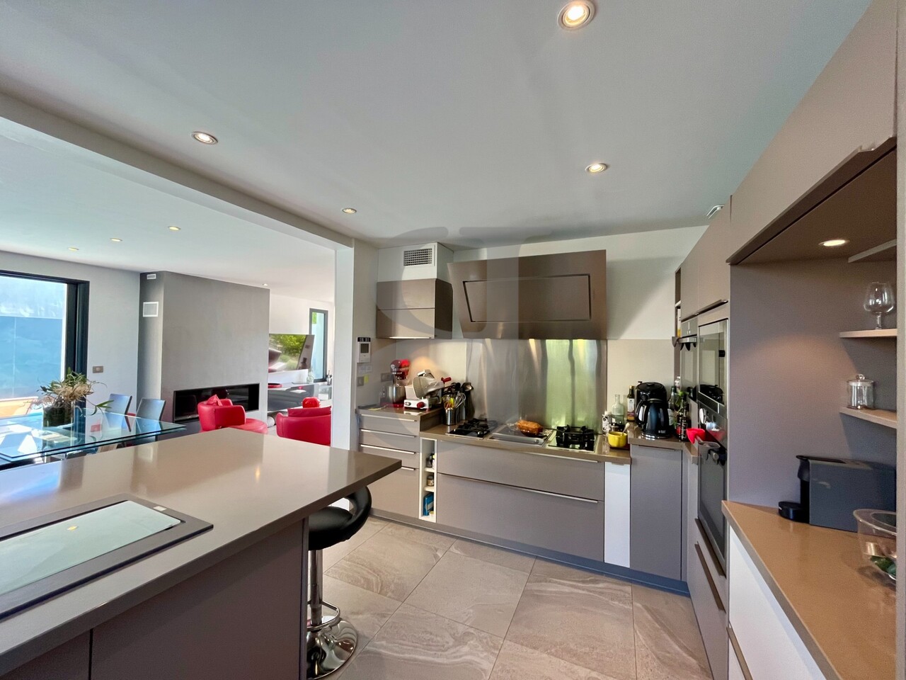 Au rez-de-chaussée, vous trouverez un grand séjour lumineux avec cheminée ouvert sur une cuisine équipée semi-professionnelle. L'espace de vie offre un accès direct sur l'extérieur grâce à ses baies à galandage. Sur ce même niveau, une spacieuse suite parentale d'un peu plus de 40 m² comprenant un dressing, une salle de bains avec double vasque, douche à l'italienne et baignoire, ainsi qu'un wc indépendant. Une entrée, un espace buanderie et des wc invités complètent l'ensemble.
