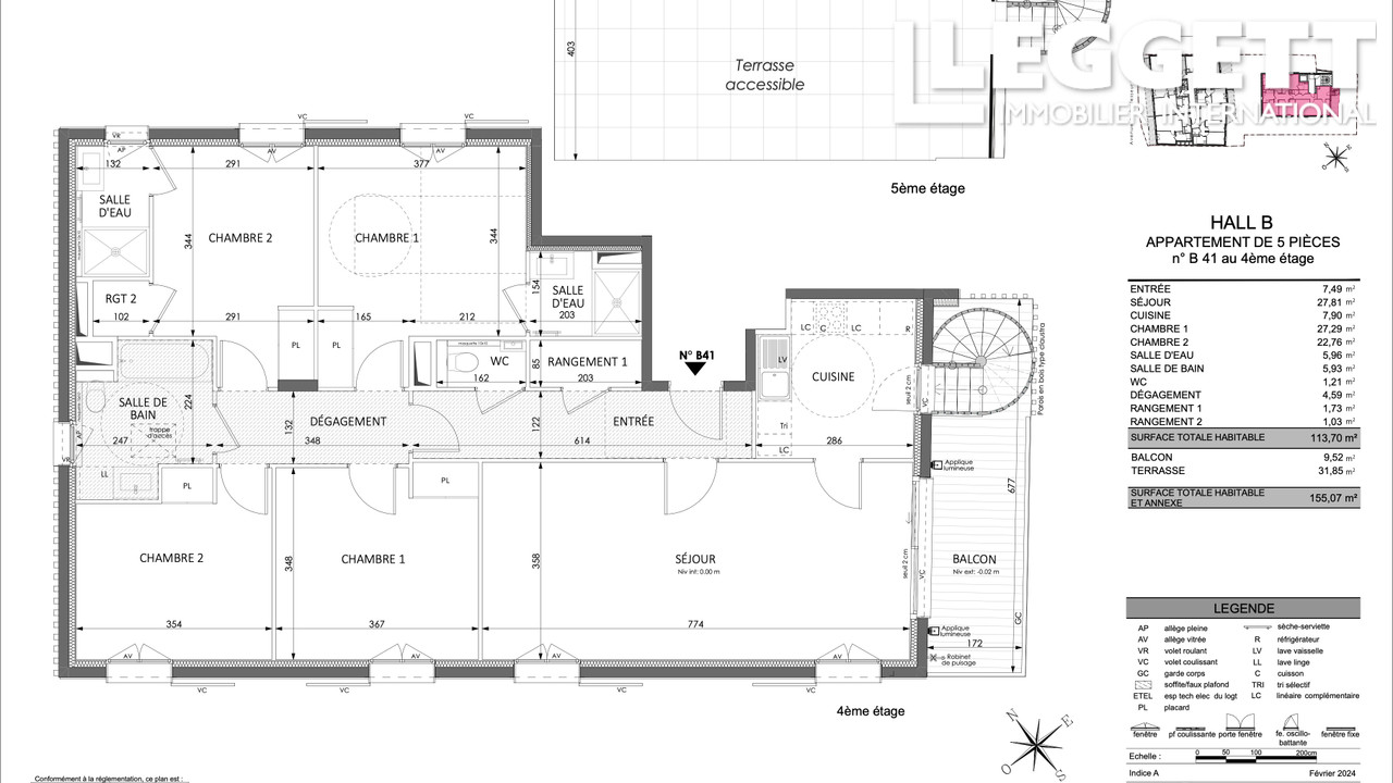 Appartement situé en dernier étage avec terrasse privative sur le toit, il comprend : l'entrée, un séjour avec un balcon attenant, cuisine, 4 chambres dont 2 avec salle de douche, 1 salle de bains, 2 wc, nombreux rangements.
