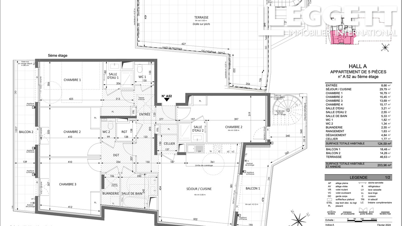 Appartement situé en dernier étage avec terrasse privative sur le toit, il comprend : une entrée, un séjour avec une terrasse attenante, cuisine ouverte, 4 chambres dont 3 avec salle de douche, 1 salle de bains, 3 wc, nombreux rangements. Toutes les pièces ouvrent sur une terrasse ou un balcon.