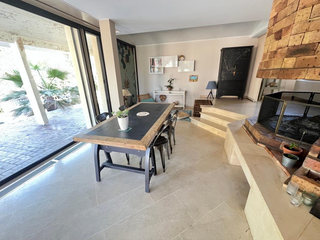 Salon / salle à manger lumineux avec grandes baies vitrées donnant sur la terrasse