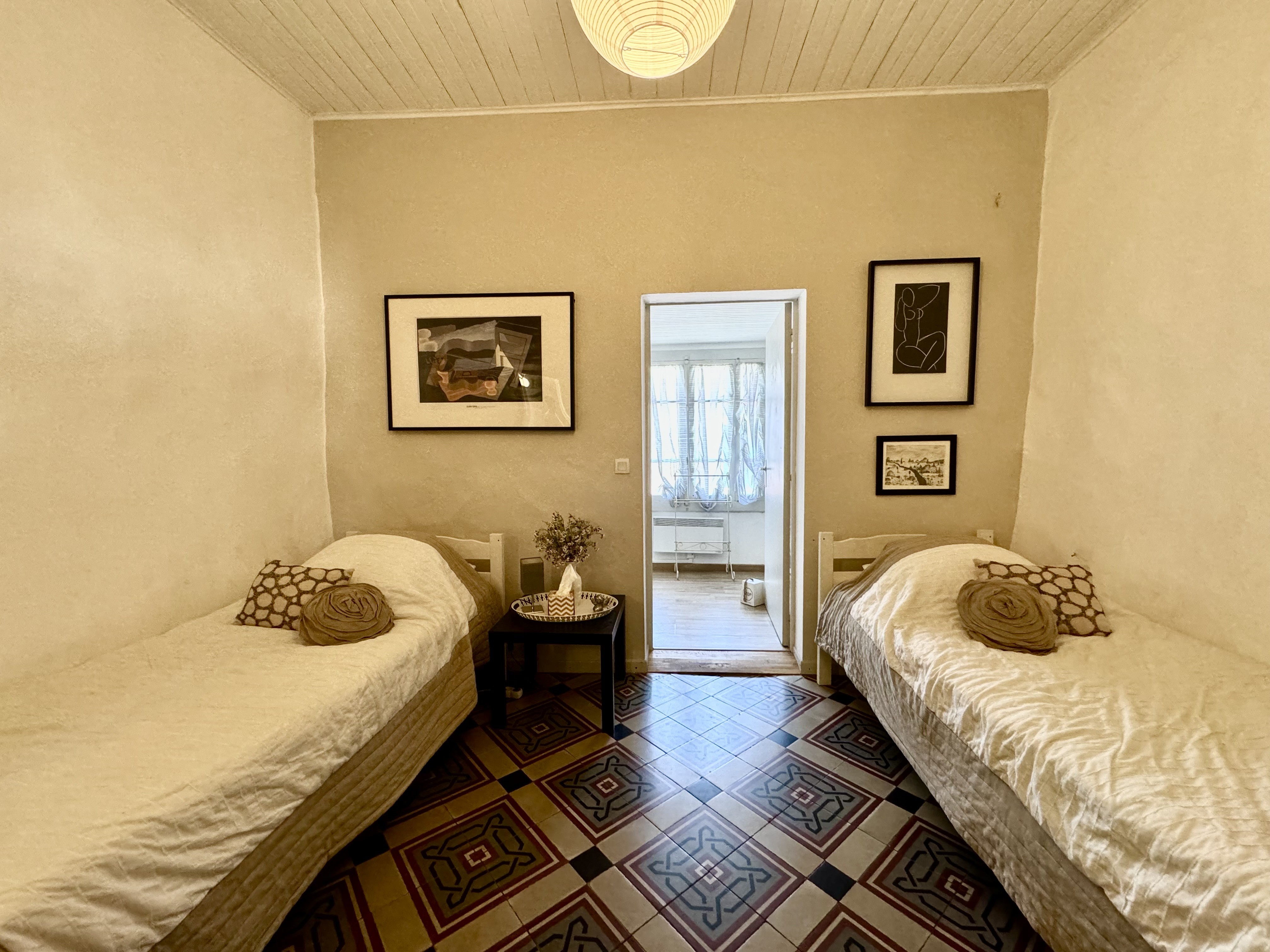 Ce niveau propose deux chambres supplémentaires, dont une avec sa propre salle d'eau. Chaque pièce est décorée avec goût, dans le même esprit "British" : papiers peints fleuris, mobilier vintage, et ambiance feutrée. Un coin salon permet également d'aménager un espace détente ou bureau, selon vos besoins.