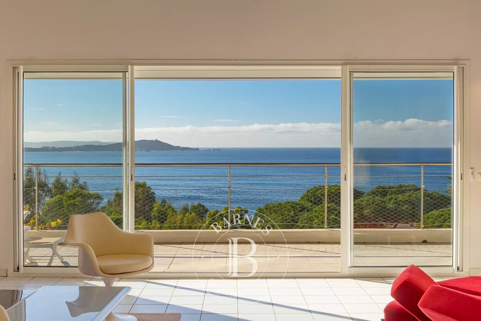 La villa, d’une surface d’environ 440 m², offre une vue mer panoramique et comprend un vaste séjour, une salle à manger ouverte sur de larges terrasses, une cuisine équipée et une buanderie.