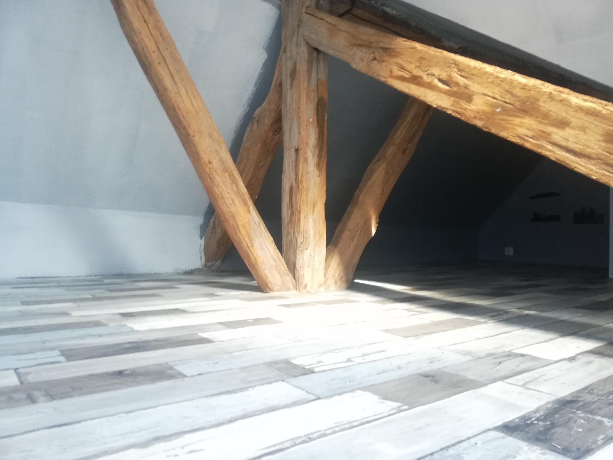 A l'étage, un palier d'environ 16 m2 dessert, un bureau, 2 chambres, wc indépendant et une salle de bains d'environ 9 m2. Sur le palier, l'échelle de meunier méne aux combles lumineux par son grand velux.