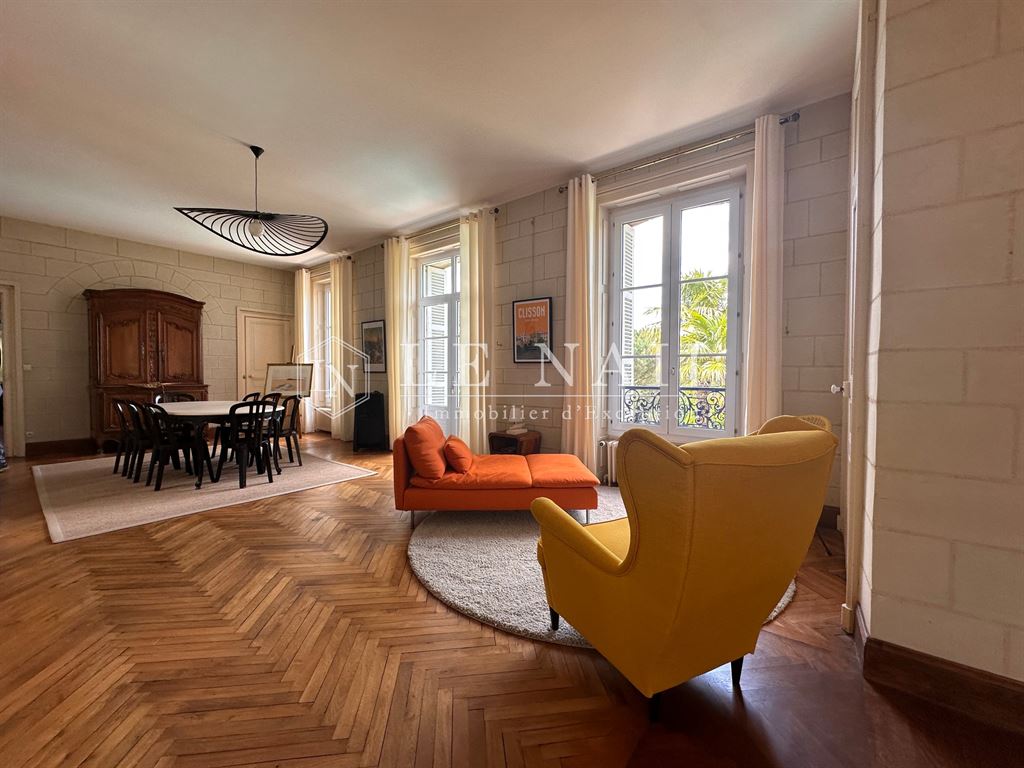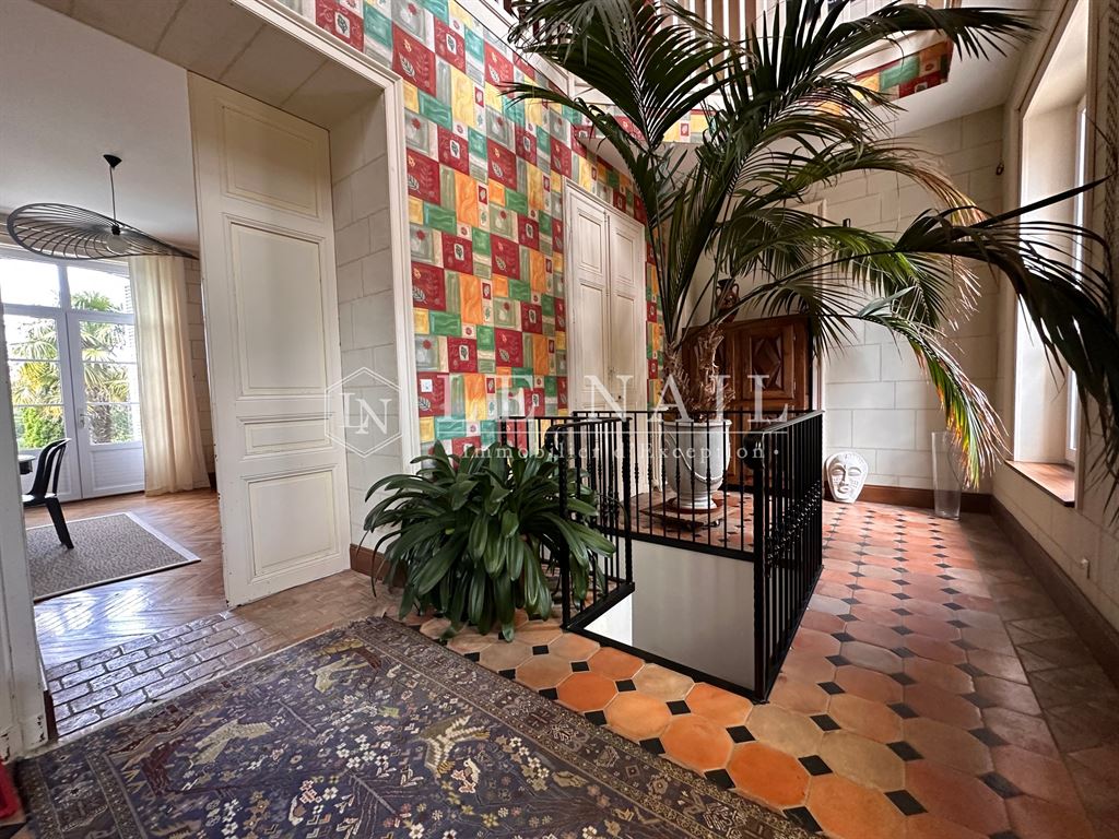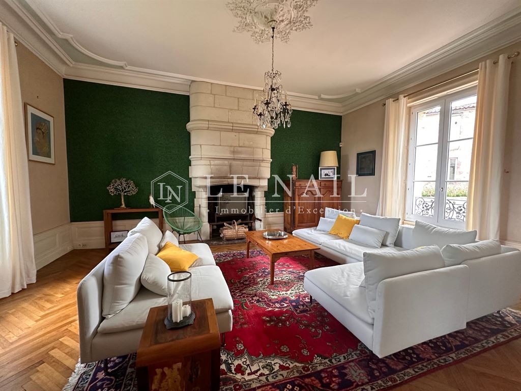 Au rez-de-chaussée : le hall avec un carrelage à cabochon ouvre sur un grand séjour lumineux tourné vers le parc, avec boiseries, moulures et rosaces. Cette pièce de vie est composée d’une partie salle à manger et d’une partie salon, ayant conservé une grande cheminée en pierres blanches. Une cuisine aménagée et équipée, et une arrière cuisine complète le rez-de-chaussée. Toilette.
