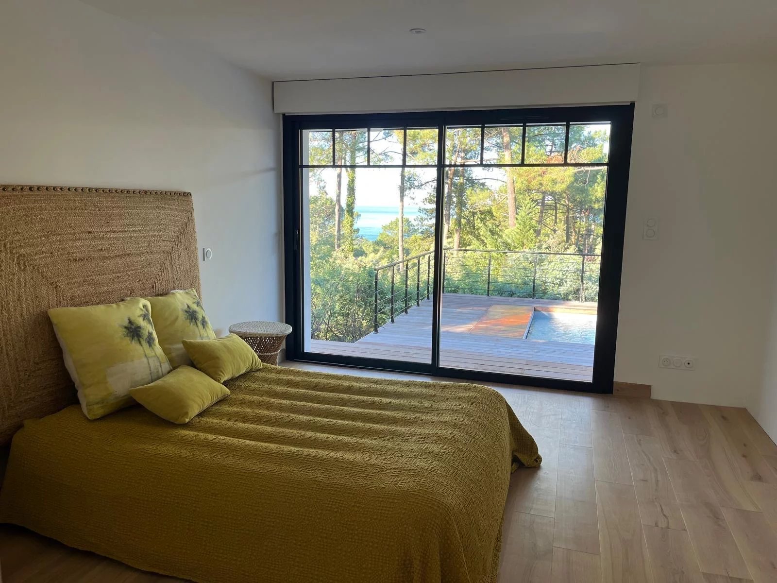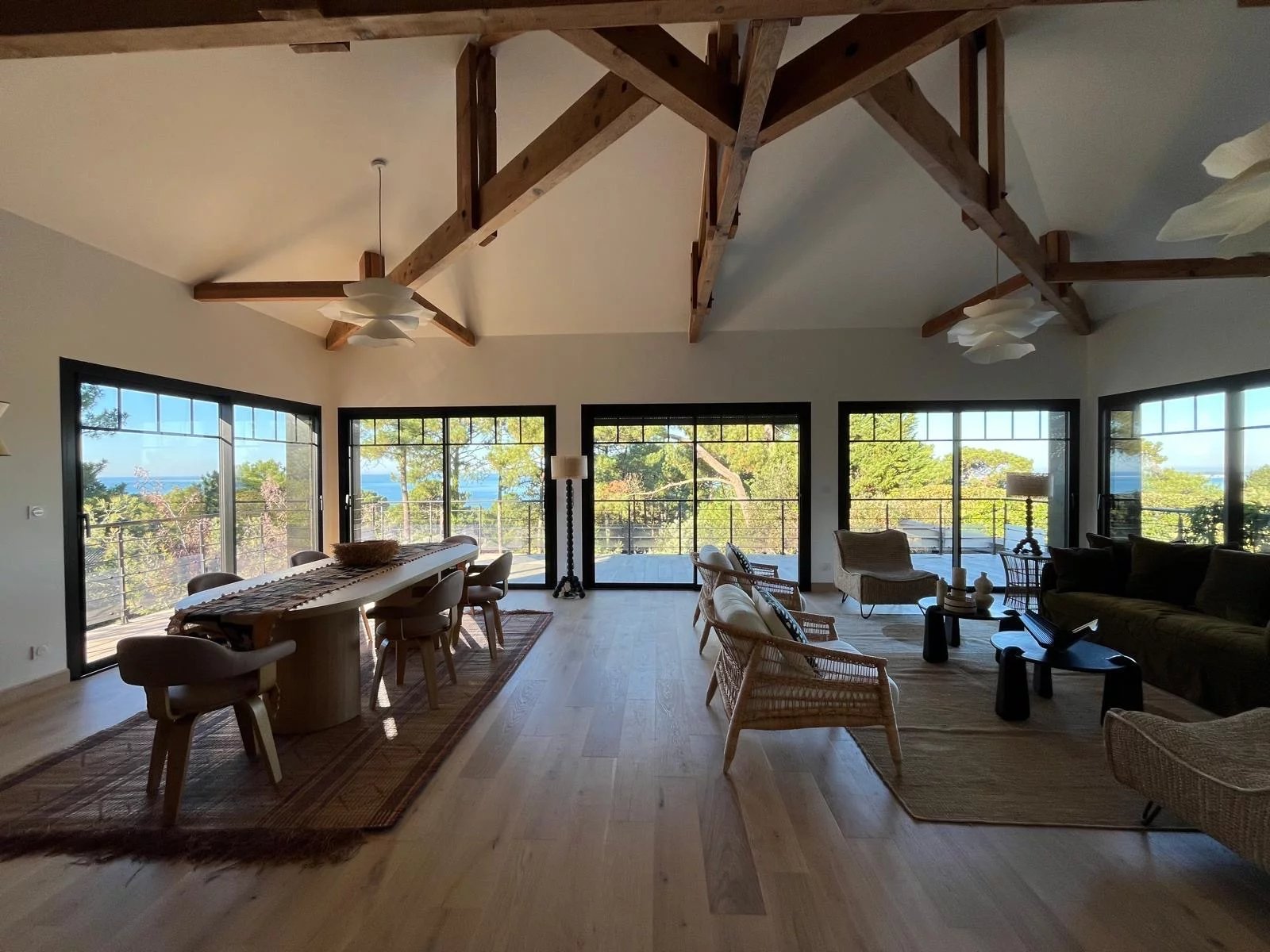 laissez-vous captiver par l'horizon. Les espaces de vie baignés de lumière s'ouvrent harmonieusement sur l'extérieur, créant une fluidité parfaite entre l'intérieur et la nature environnante. Le salon et la salle à manger forment un ensemble chaleureux et élégant, avec une cuisine ouverte parfaitement équipée. Cette villa d'exception dévoile deux superbes suites parentales, dont l'une avec une vue imprenable sur le Bassin. L'espace nuit est complété par trois chambres supplémentaires, parmi lesquelles l'une, orientée plein ouest, offre également une vue sur mer .