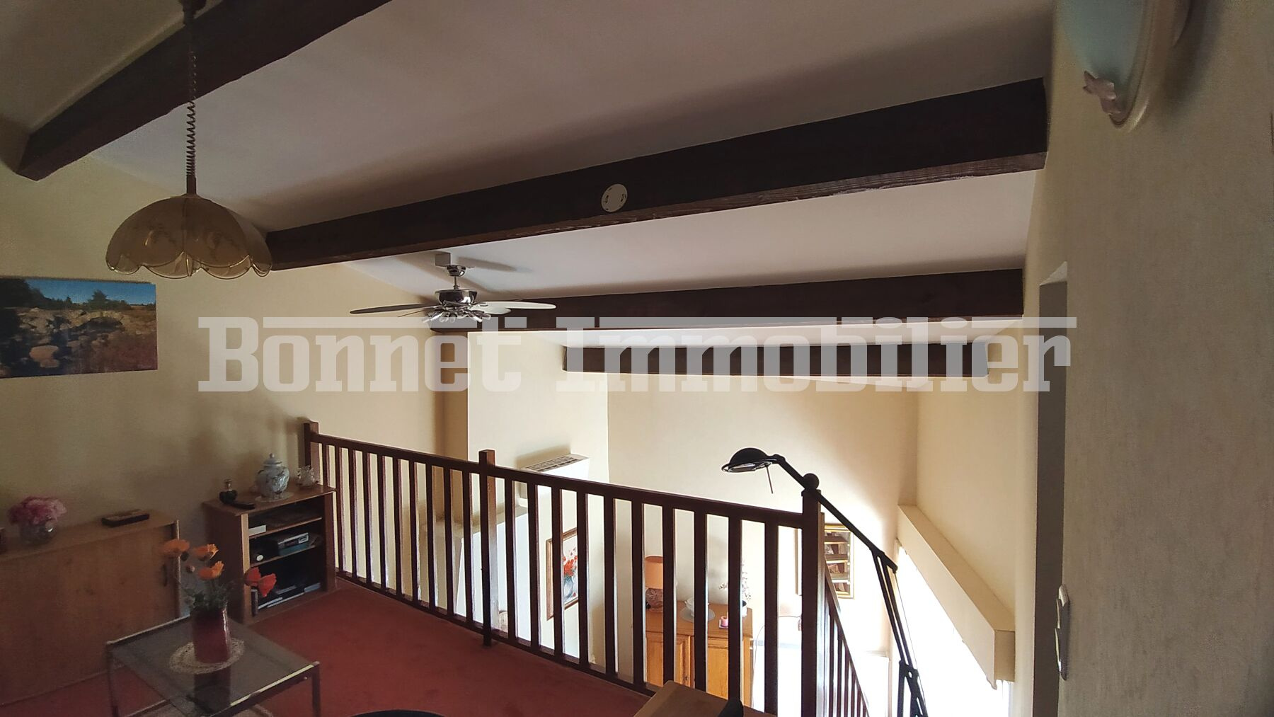 Le niveau principal à vivre est composé d'une entrée avec placard, d'un lumineux séjour avec cheminée ouvrant sur une agréable véranda exposée sud-est avec vue dégagée sur les collines environnantes, d'une cuisine équipée, d'une chambre parentale avec une salle de bains, d'un cellier et de wc séparés. À l'étage, la belle mezzanine faisant aujourd'hui office de bureau donne accès à une chambre orientée au sud et à l'ouest disposant de sa propre salle d'eau. Un parking privatif et une cave en sous-sol complètent cet appartement équipé de climatisations réversibles.
